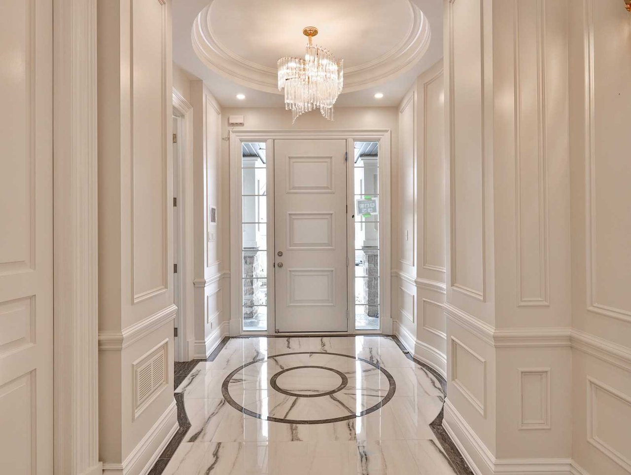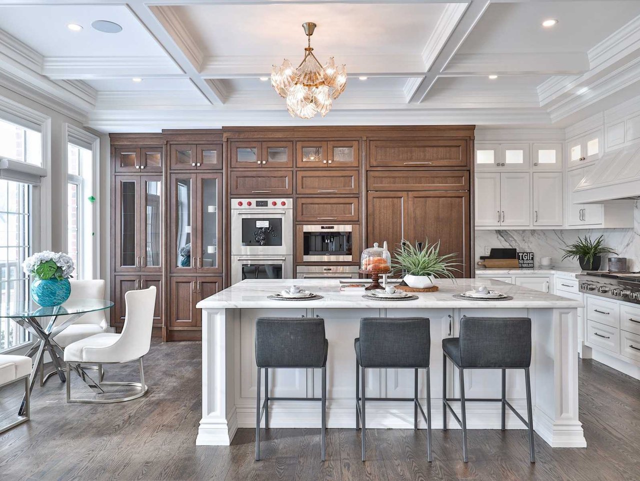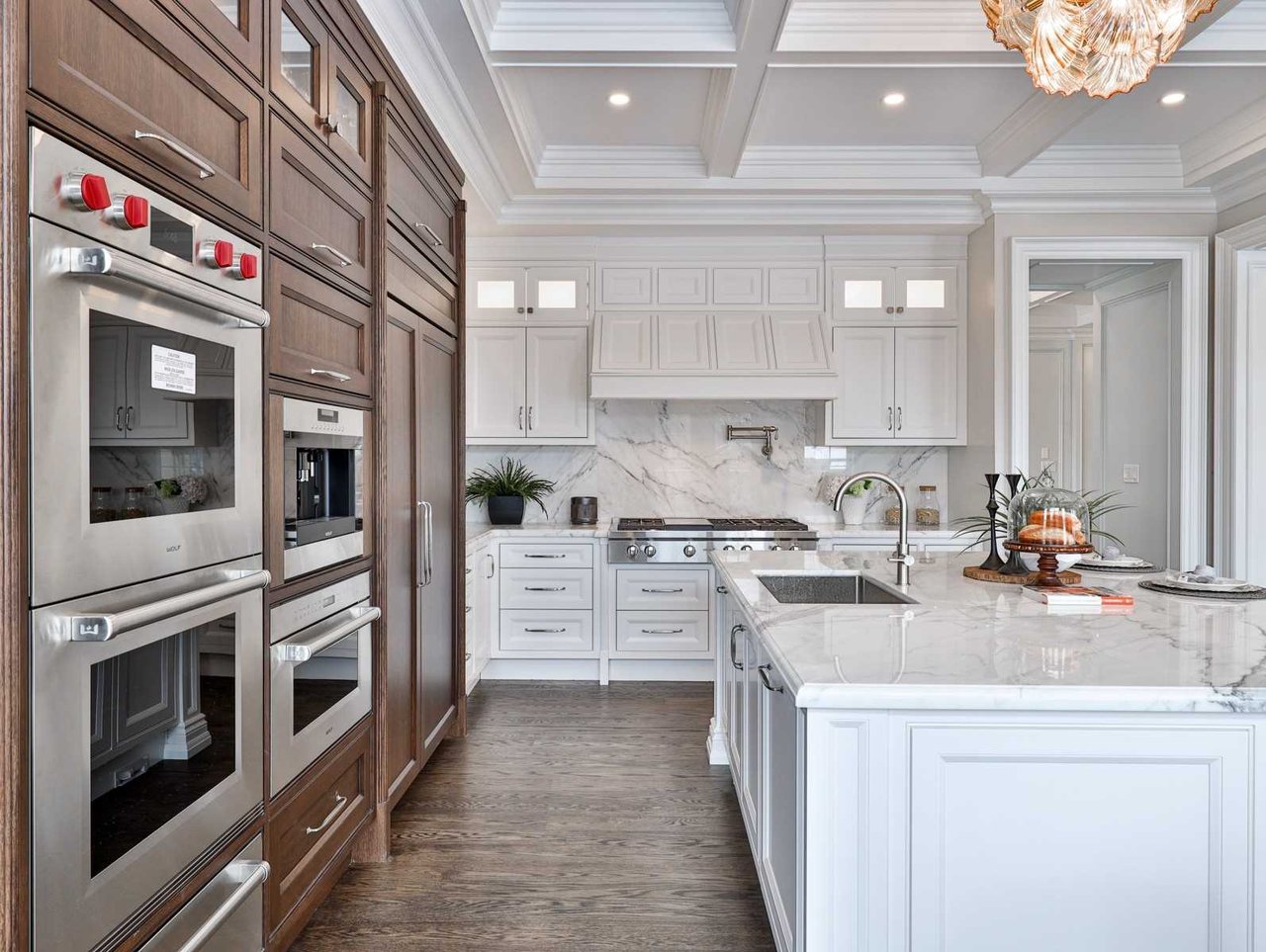 The Gourmet, eat-in chef inspired Kitchen, open in design to the Family Room and entered through a recessed paneled archway off of the Grand Hall, features built-in speakers, oak hardwood floor, crown molding, pot lights, coffered waffle ceiling, chandelier, marble countertop and backsplash, under valence lighting, illuminated glass front display cabinets, an expansive stainless steel under mount sink, pot filler, windows outfitted with custom blinds overlooking the rear gardens and a Juliet balcony overlooking the gardens. The Kitchen also features an expansive center island complete with a breakfast bar and an archway opening onto the Dining Room.