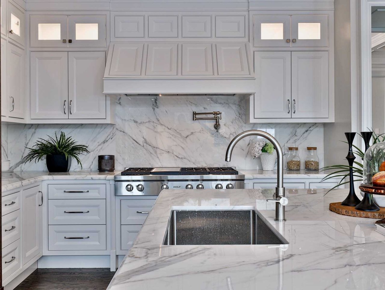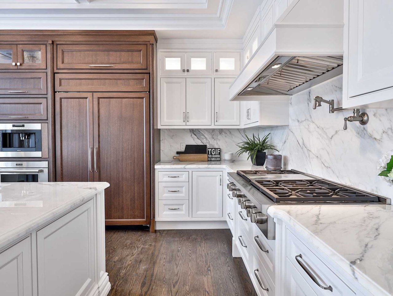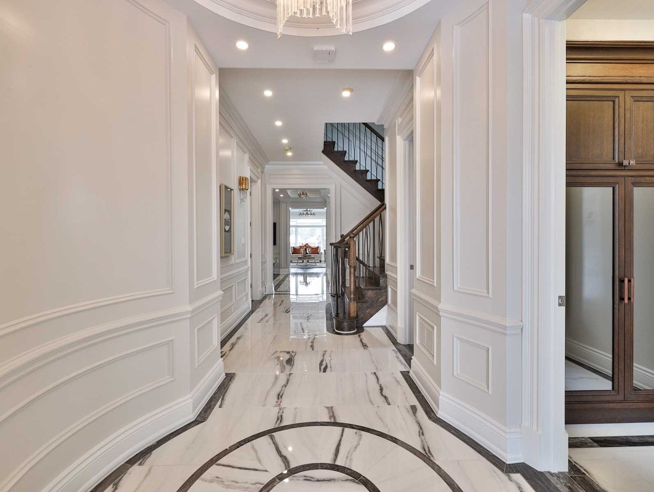 The Gourmet, eat-in chef inspired Kitchen, open in design to the Family Room and entered through a recessed paneled archway off of the Grand Hall, features built-in speakers, oak hardwood floor, crown molding, pot lights, coffered waffle ceiling, chandelier, marble countertop and backsplash, under valence lighting, illuminated glass front display cabinets, an expansive stainless steel under mount sink, pot filler, windows outfitted with custom blinds overlooking the rear gardens and a Juliet balcony overlooking the gardens. The Kitchen also features an expansive center island complete with a breakfast bar and an archway opening onto the Dining Room.