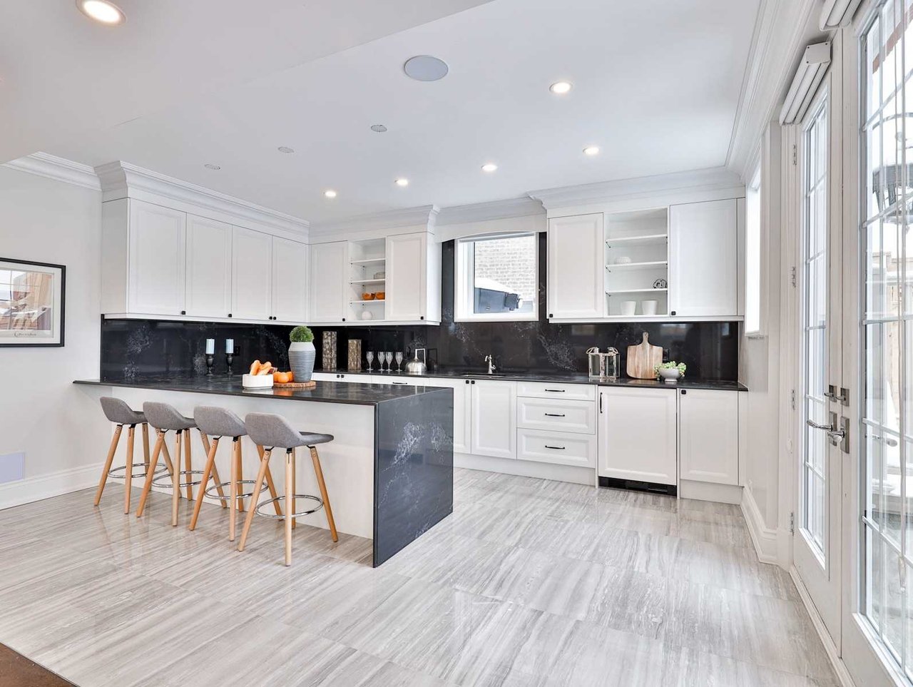 The expansive Wet Bar, open in design to the Recreation Room, features caesarstone countertop and backsplash, built-in speakers, a window, ample storage, custom designed and crafted floor-to-ceiling cabinets, open display shelving, a bar area, closed cabinetry and a stainless steel under mount sink with a retractable faucet.