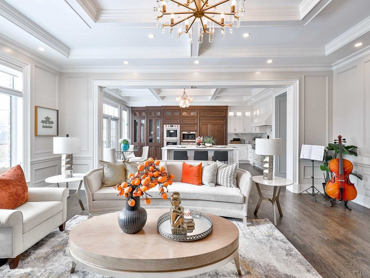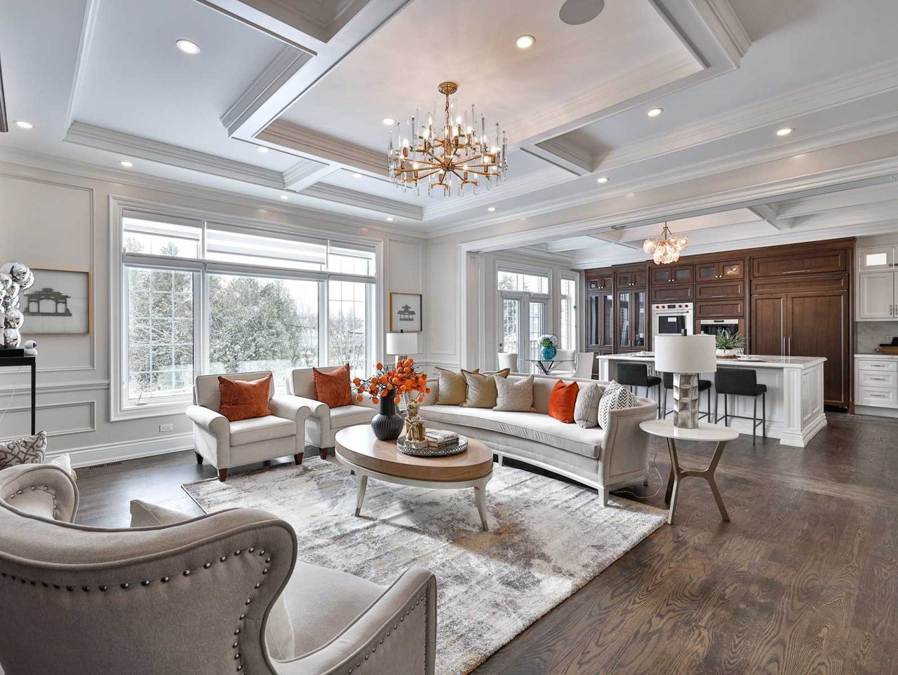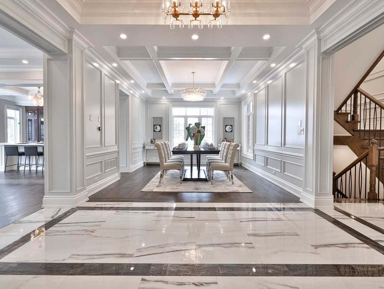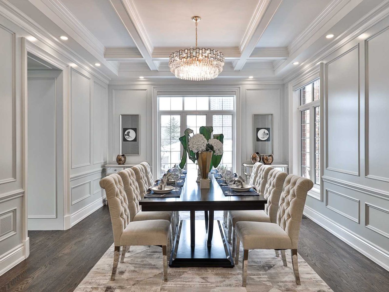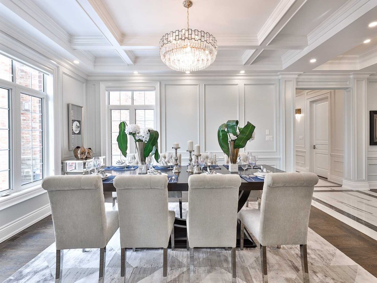 The Dining Room, open in design to the Living Room, features oak hardwood floor, pot lights, floor-to-ceiling recessed paneled walls, coffered waffle ceiling design, chandelier, windows outfitted with custom blinds overlooking the side gardens and an archway opening onto the Kitchen.