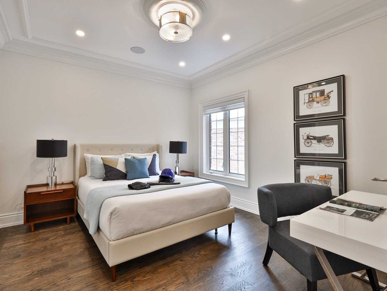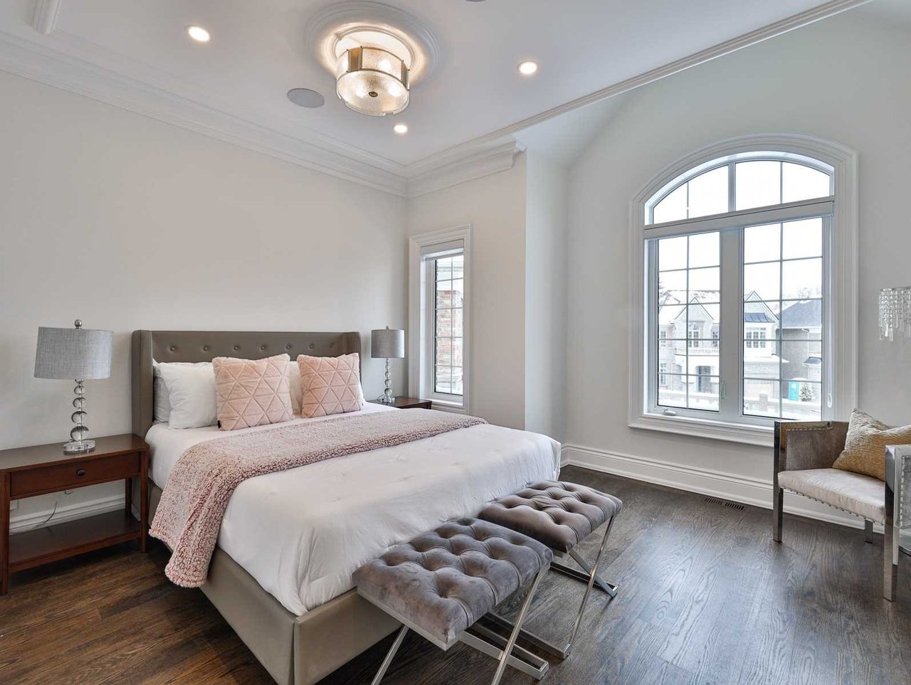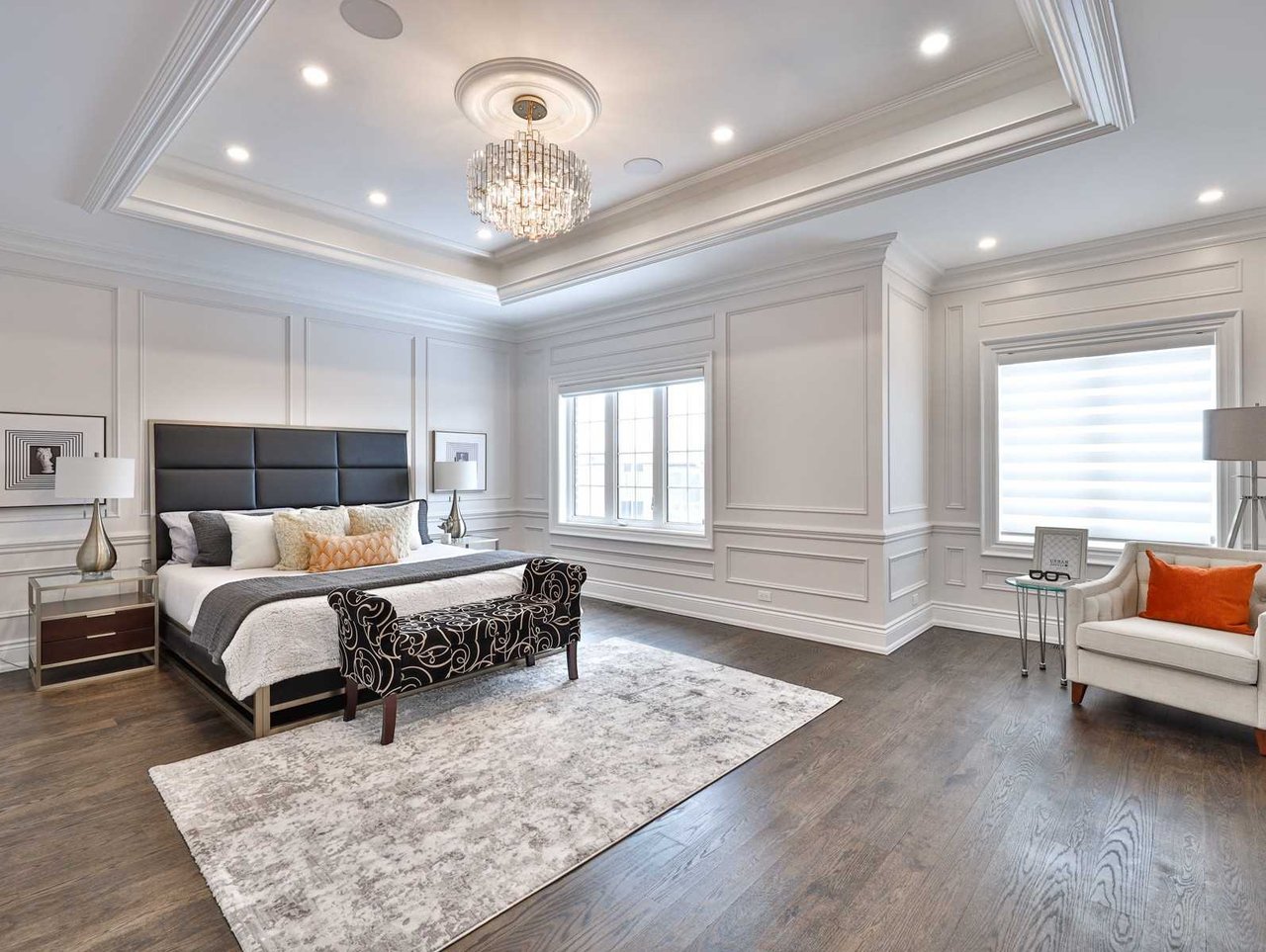 The Bedroom area features oak hardwood floor, chandelier medallion, chandelier, pot lights, crown molding, coffered ceiling, floor-to-ceiling recessed paneled wall and a picture windows outfitted with custom blinds overlooking the rear gardens.