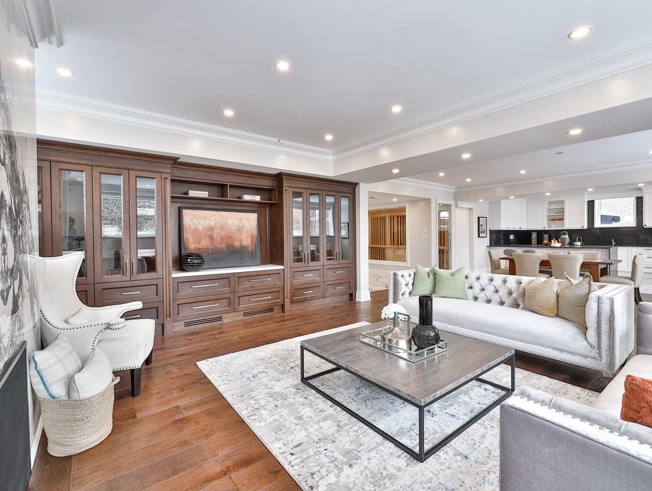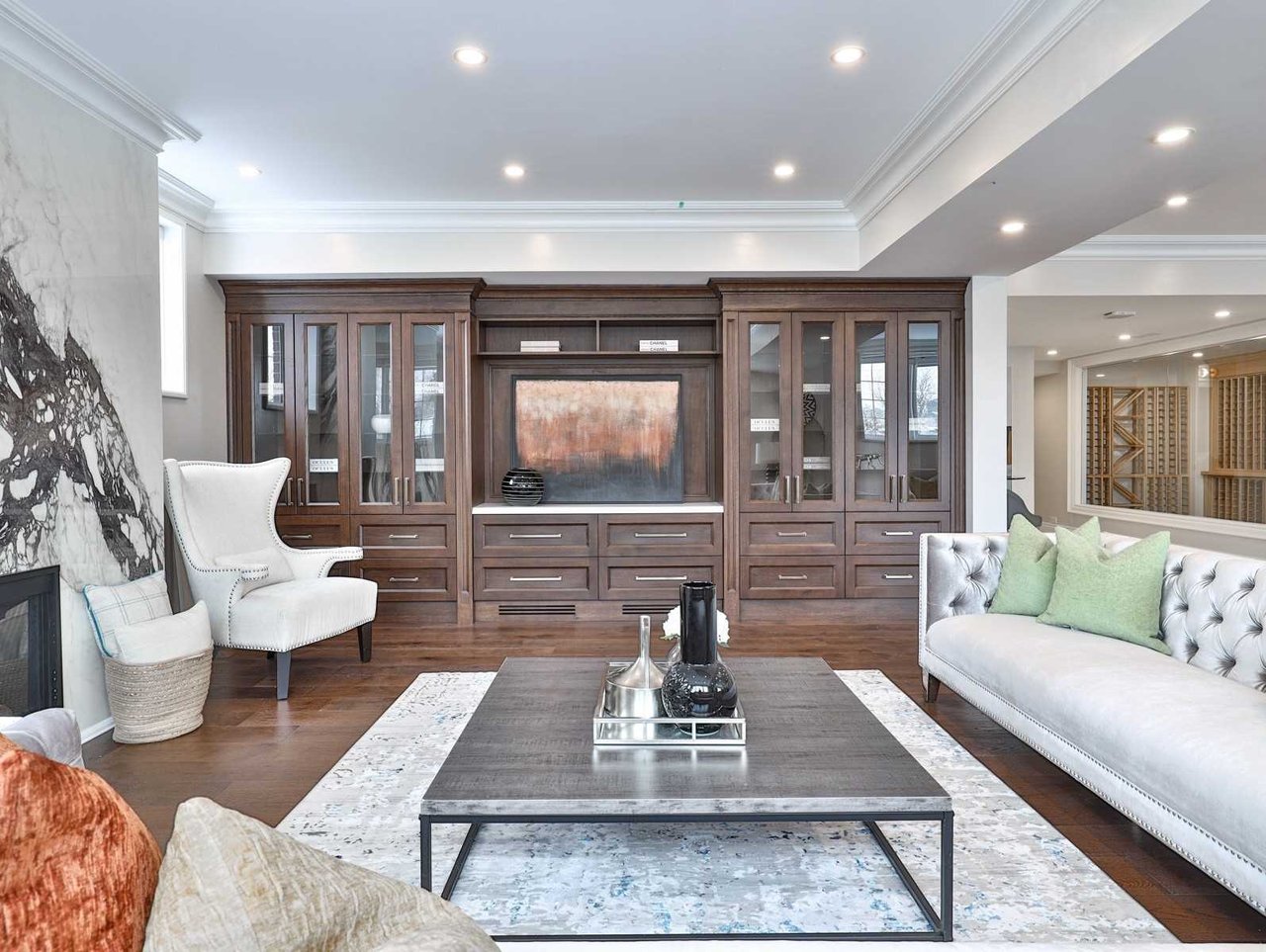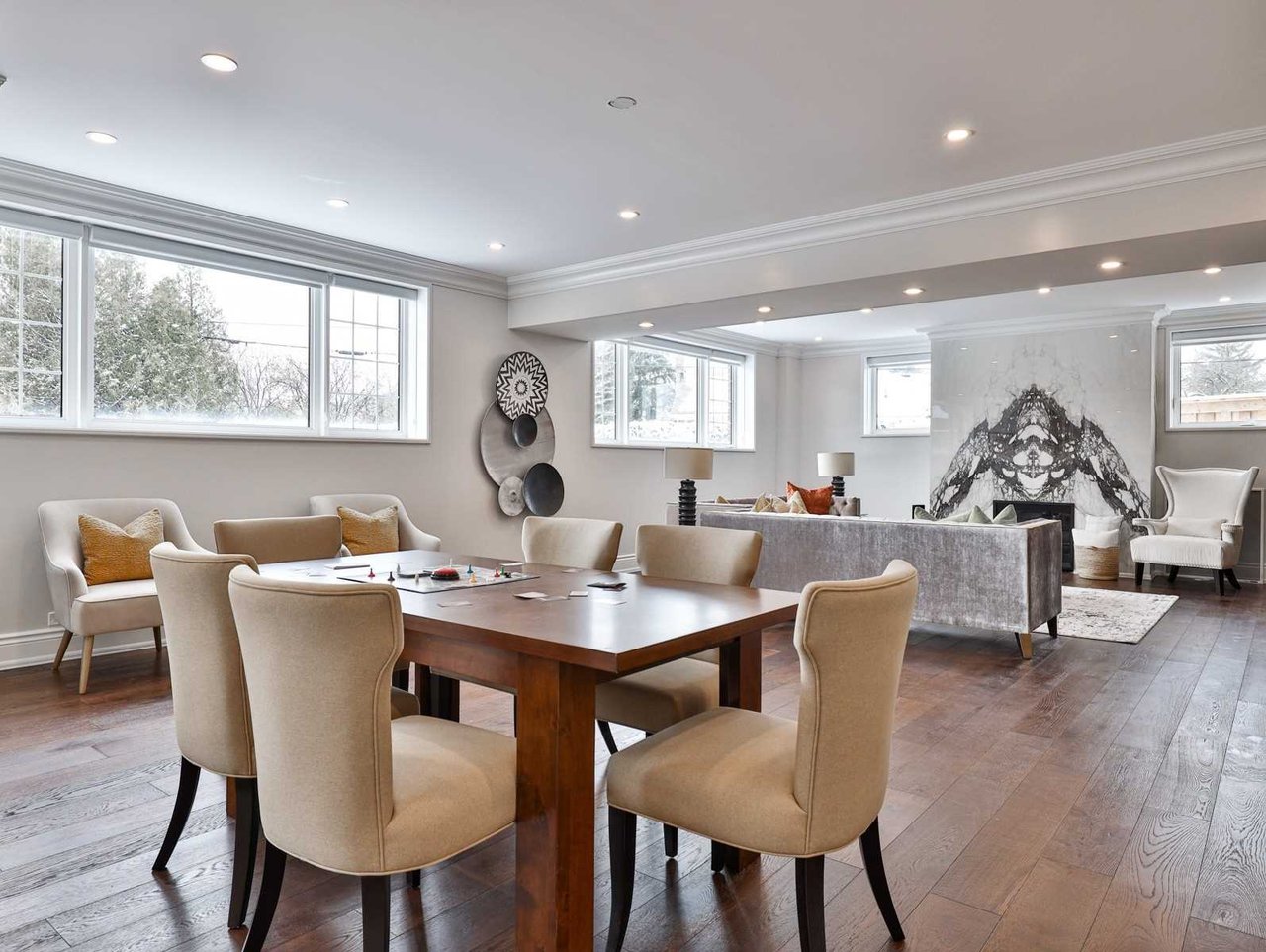 The Recreation Room, open in design to the Wet Bar, features heated engineered hardwood floor, pot lights, crown molding, built-in speakers, above grade windows outfitted with custom blinds, a dining area, a pair of doors leading up to the rear gardens, custom wall-to-wall built-ins comprised of glass front display cabinets and closed cabinetry and a gas fireplace with a porcelain floor-to-ceiling book matched mantle.