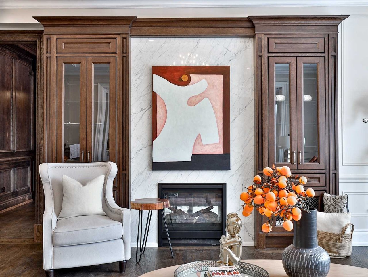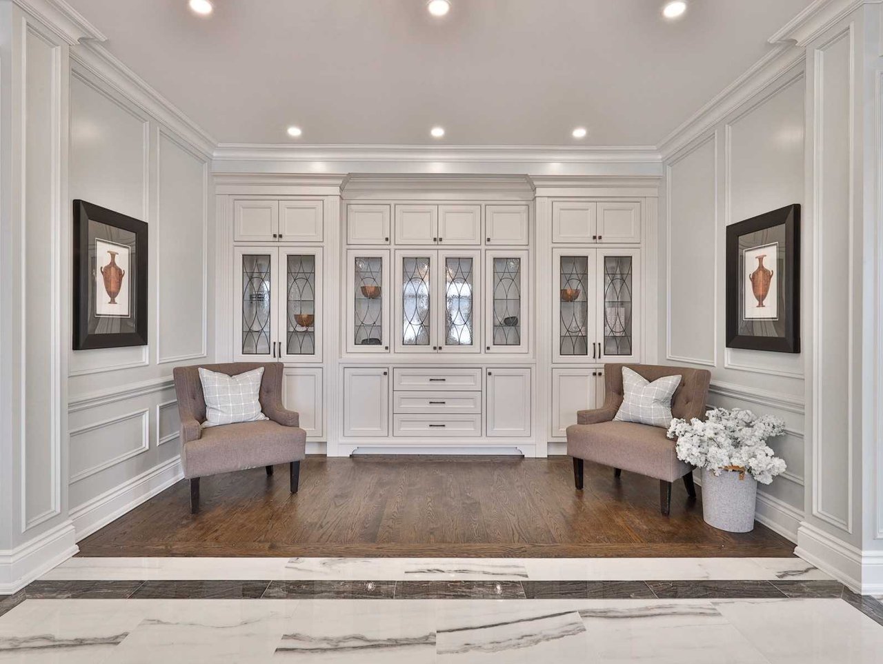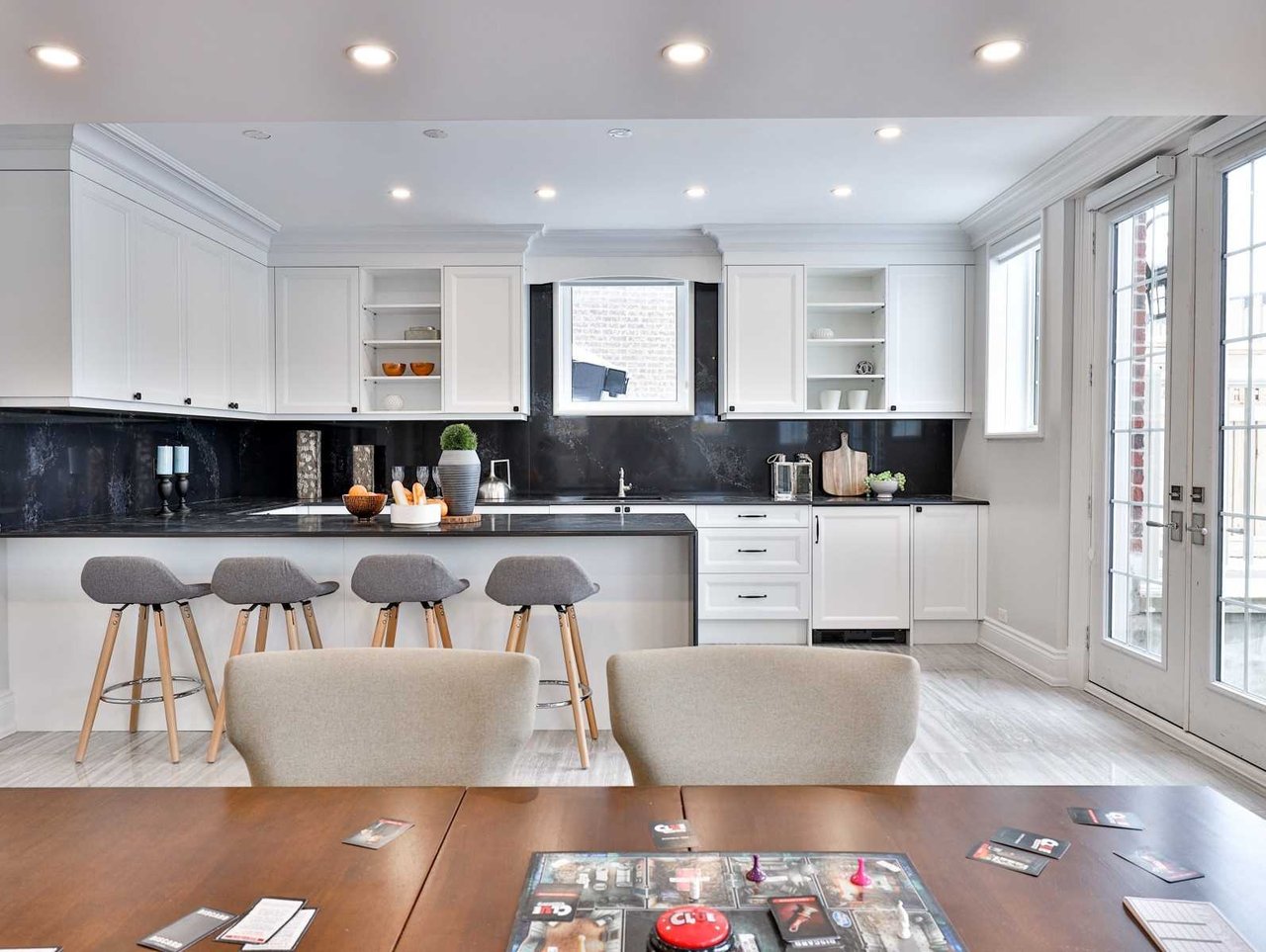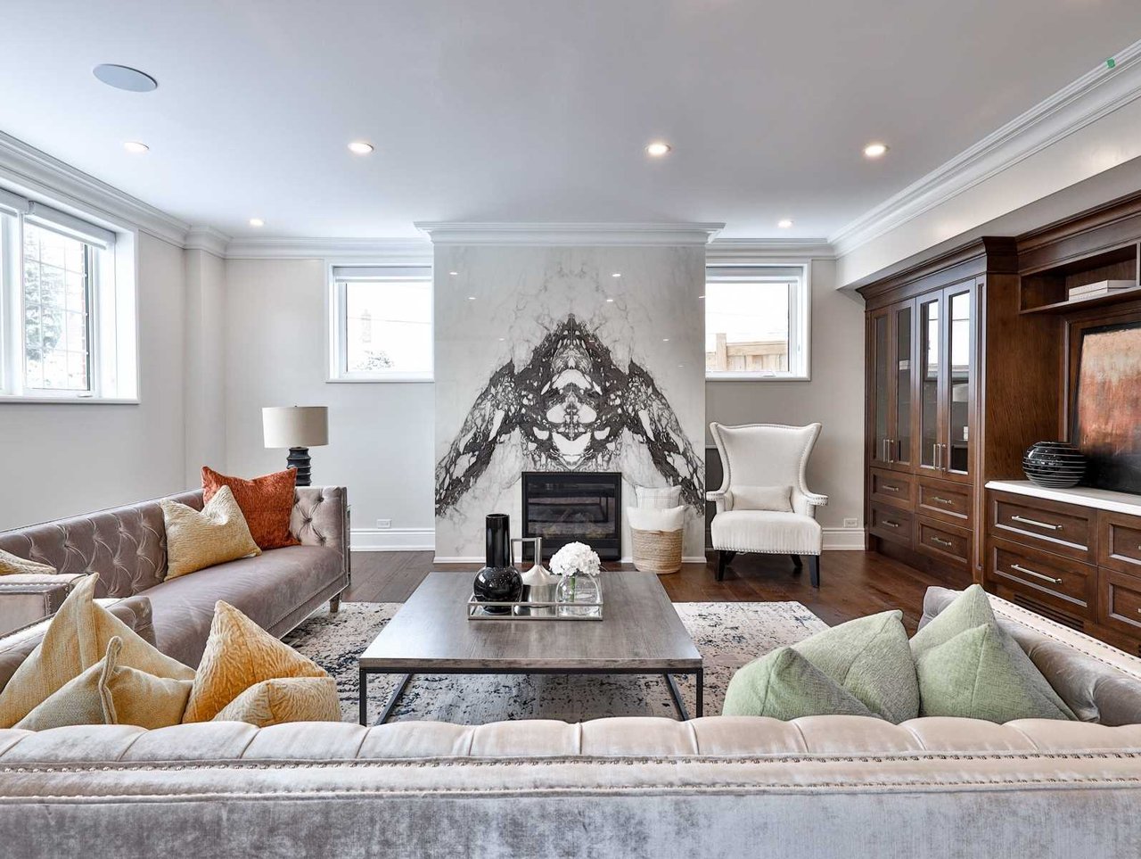 The Recreation Room, open in design to the Wet Bar, features heated engineered hardwood floor, pot lights, crown molding, built-in speakers, above grade windows outfitted with custom blinds, a dining area, a pair of doors leading up to the rear gardens, custom wall-to-wall built-ins comprised of glass front display cabinets and closed cabinetry and a gas fireplace with a porcelain floor-to-ceiling book matched mantle.