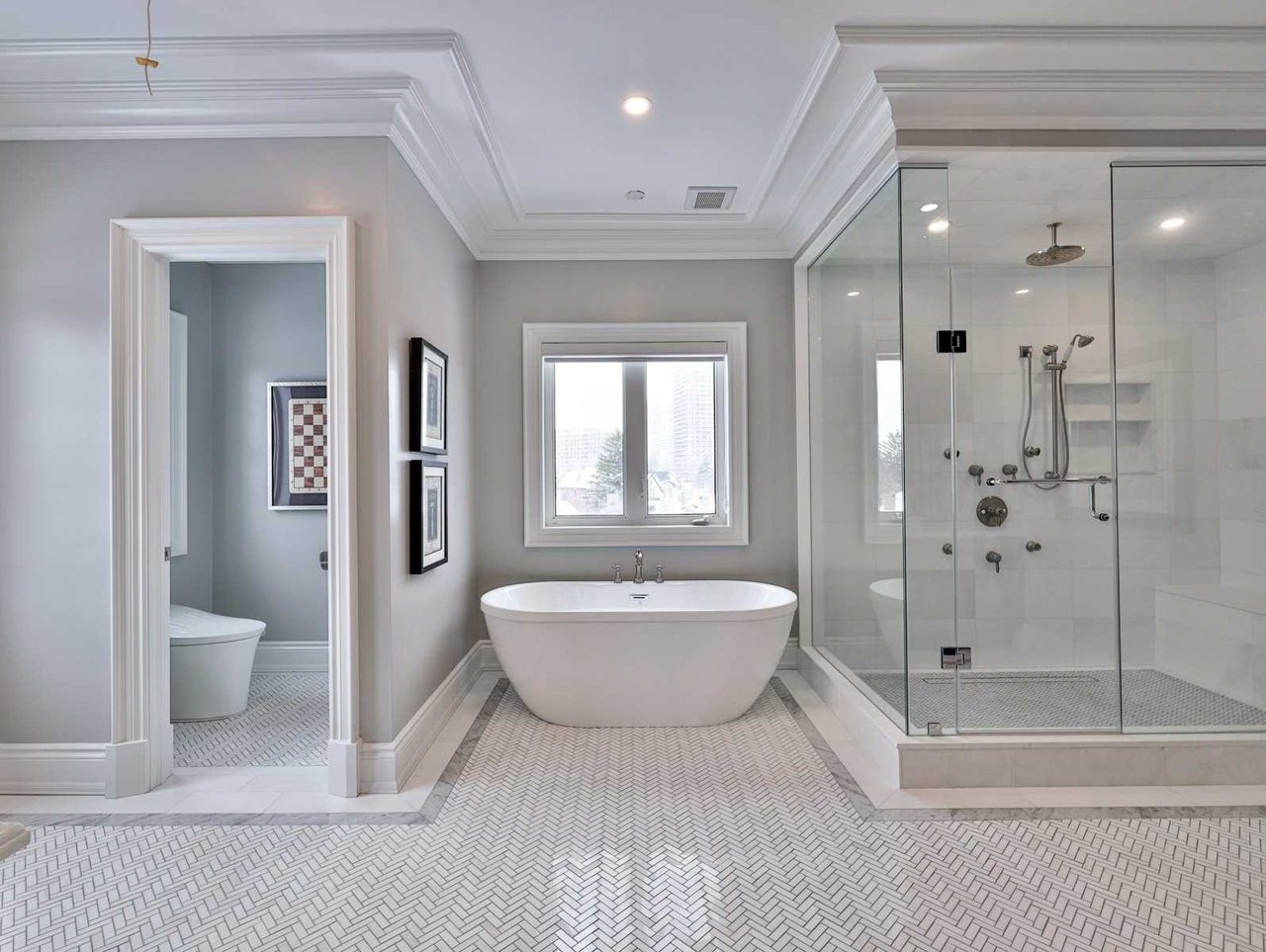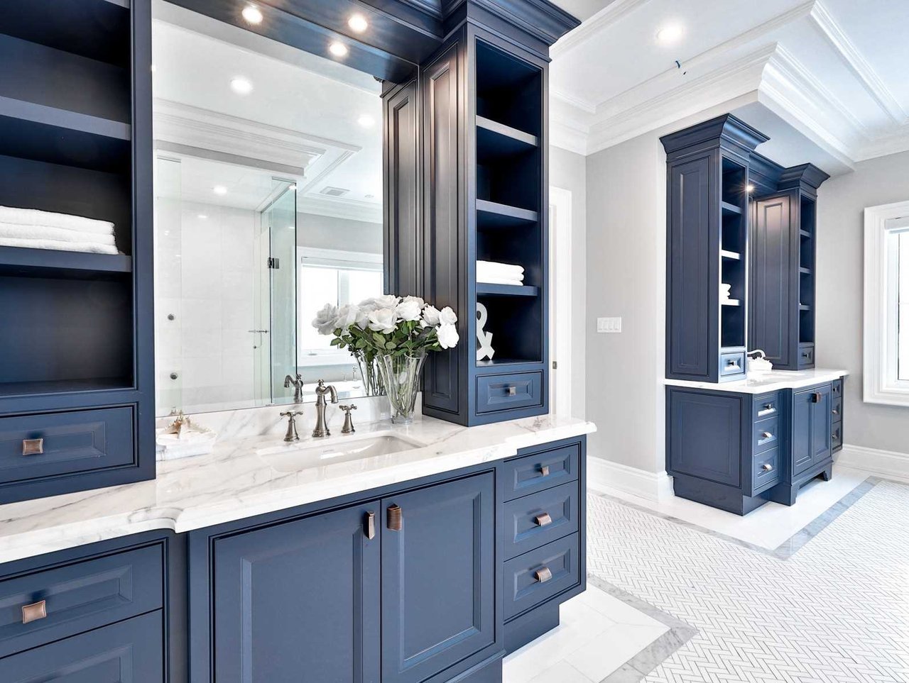 The luxurious 7-piece ensuite bath, features heated porcelain tile floor, crown molding, pot lights, windows outfitted with custom blinds overlooking the rear and side gardens, a deep soaker tub, a water closet housing the toilet and a sprawling seamless glass shower complete with a handheld faucet and rain shower head. The Ensuite also features separate “His” and “Hers” custom vanities complete with open display shelving, closed cabinets, a marble countertop and an under mount sink.