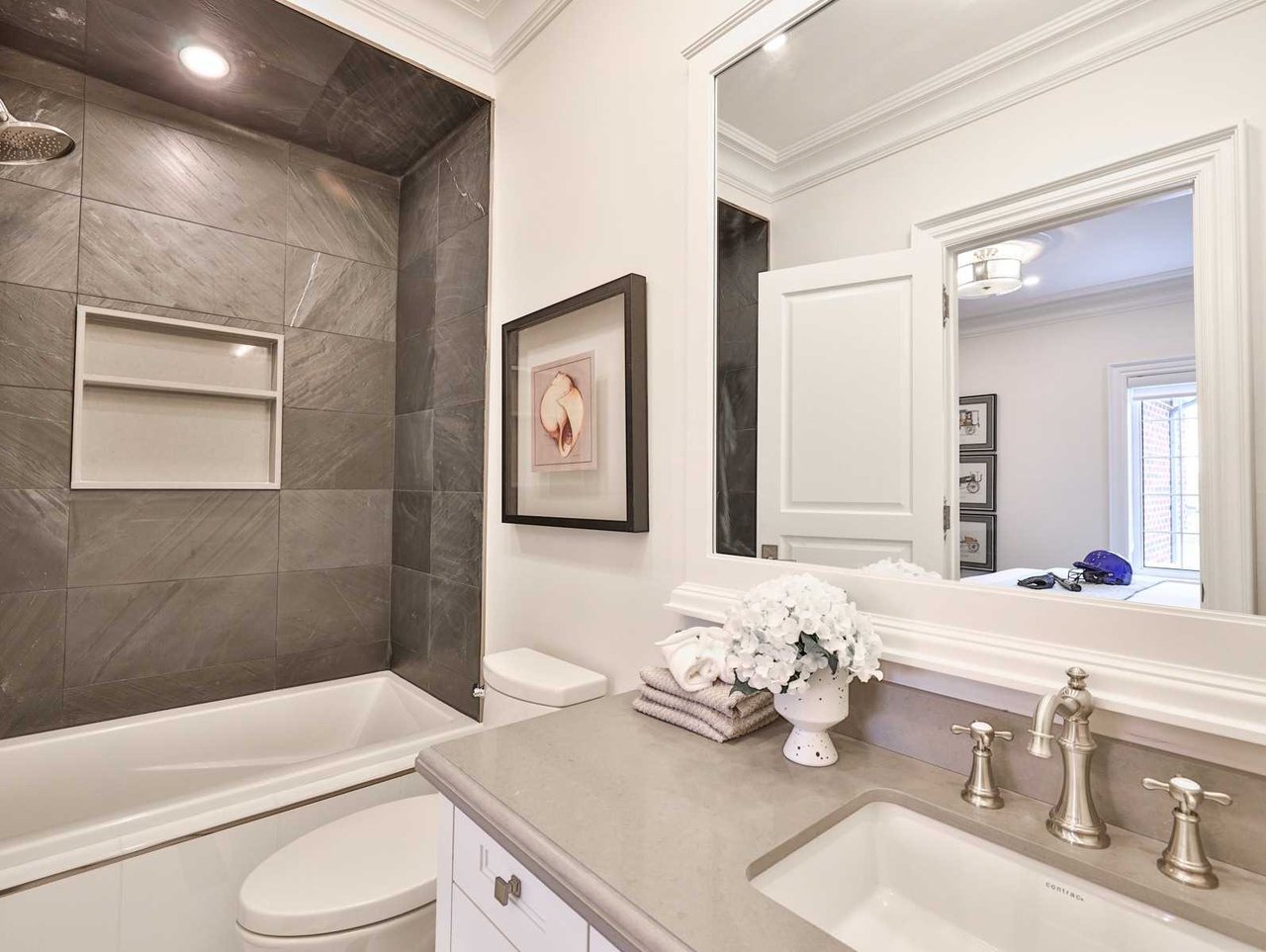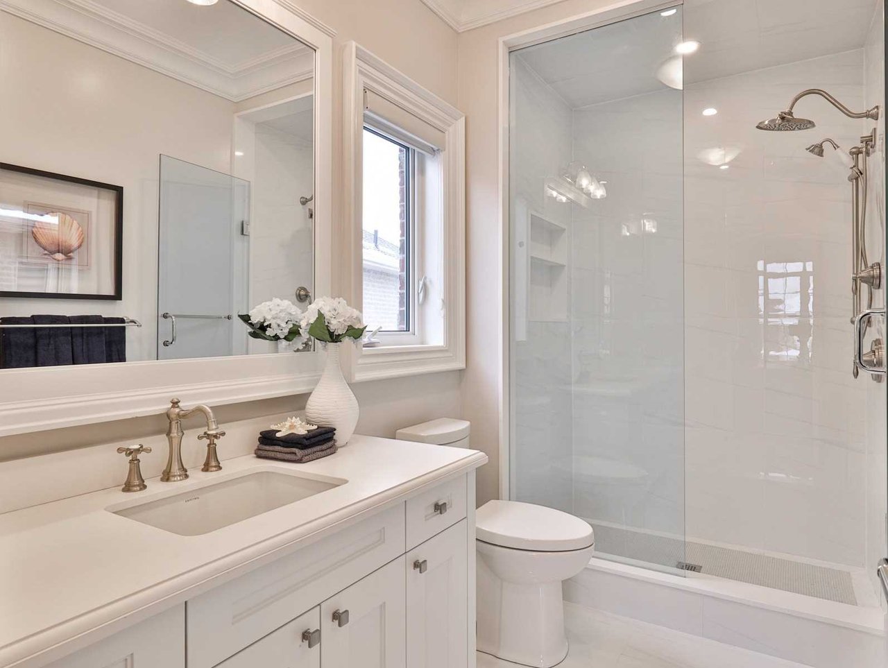 The 4-piece Hall Washroom features porcelain tile floor, mirror, pot lights, light sconce, a custom vanity, under mount sink, caesarstone countertop and a seamless glass shower complete with rain shower head, soap box and a handheld faucet.