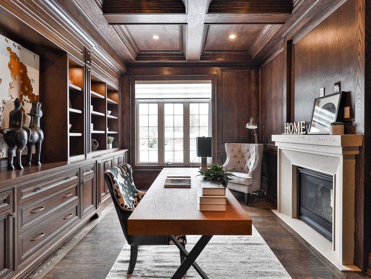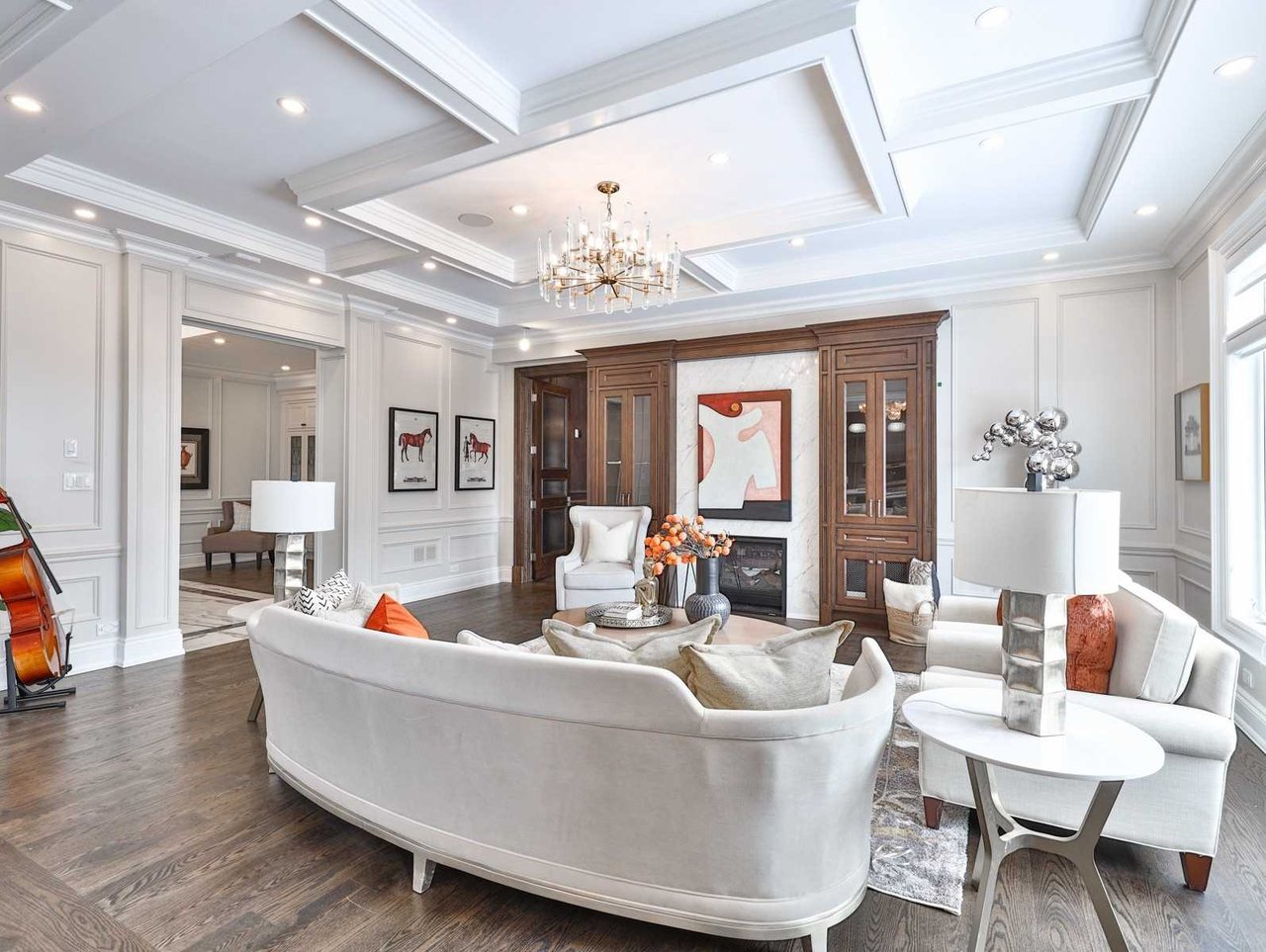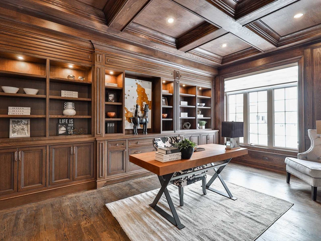 The Family Room, open in design to the Kitchen, features a door leading to the Library, oak hardwood floor, built-in speakers, crown molding, pot lights, coffered waffle ceiling, a gas fireplace with a floor-to-ceiling porcelain mantle, a picture window outfitted with custom blinds overlooking the rear gardens and custom built-in cabinetry comprised of closed cabinet, glass front cabinets and patina mesh front cabinets.