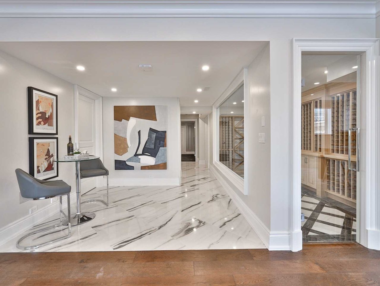 The Wine Cellar features a seamless glass door, porcelain tile floor, pot lights, custom designed and crafted wine bottle shelving and an expansive glass wall.