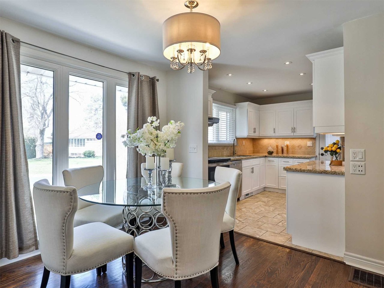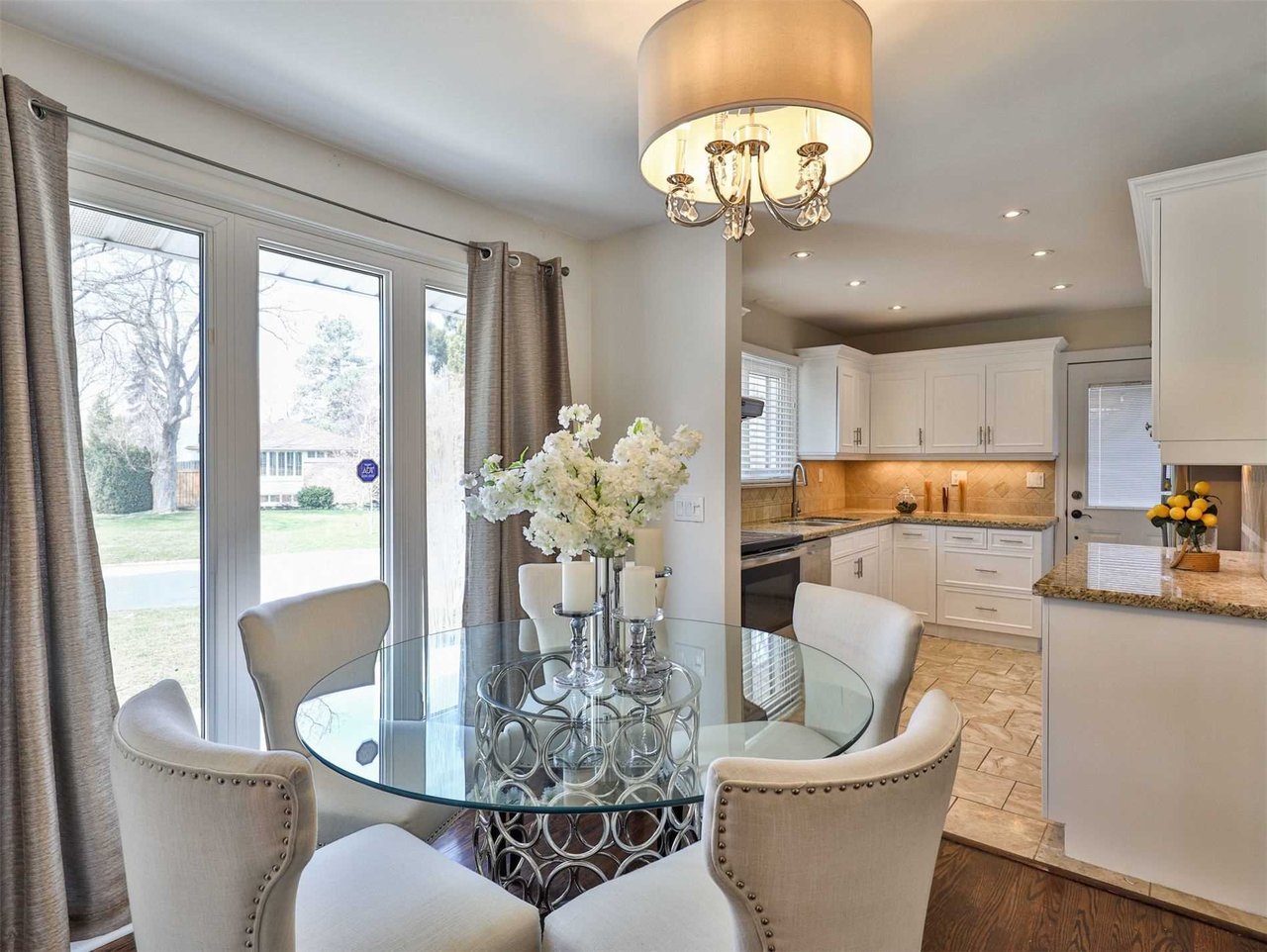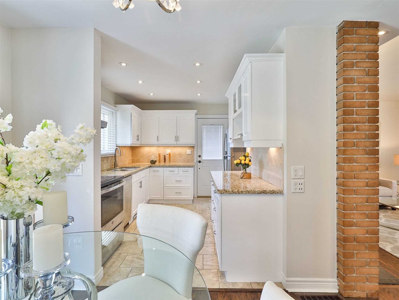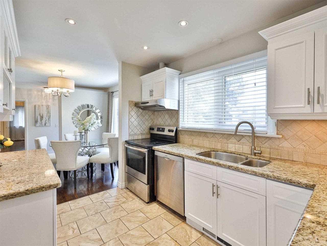 The Gourmet, chef inspired Kitchen, open in design to the Dining Room, features tile floor, pot lights, a stainless steel dual bowl under mount sink, open display shelving, a walkout to the driveway, granite countertop and tile backsplash.