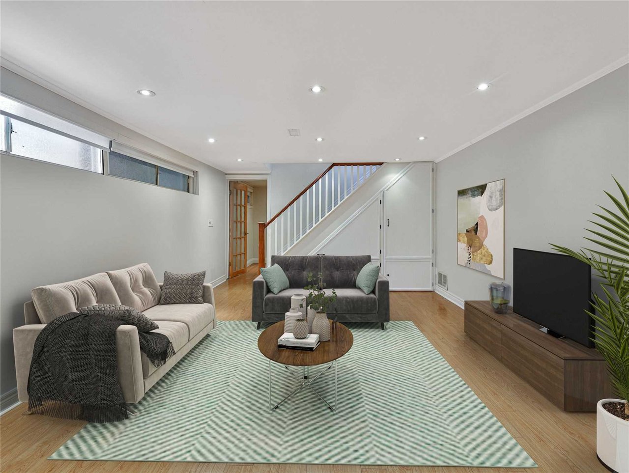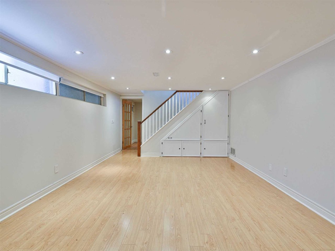 The Recreation Room features laminate floor, pot lights, crown molding and windows outfitted with blinds.