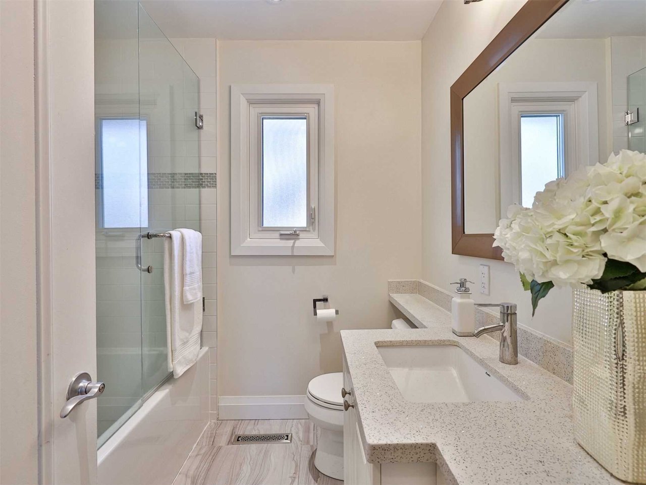 The 3-piece Hall Washroom features a vanity, mirror and a seamless glass shower.