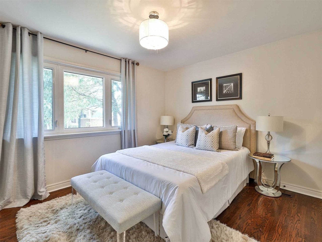 The Master Suite features hardwood floor, a light fixture, a window outfitted with drapery and “His” and “Hers” double closets.