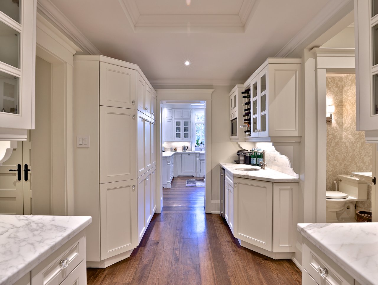 The Servery, entered through an archway off of the Kitchen and a swing door off of the Dining Room, features crown molding, wide plank reclaimed elm hardwood floor, pot lights, custom designed and crafted cabinets, Calcutta marble countertop, under valence lighting, a stainless steel under mount sink, Marvel bar refrigerator, several glass front cabinets, custom wine shelving and pantry cabinets.