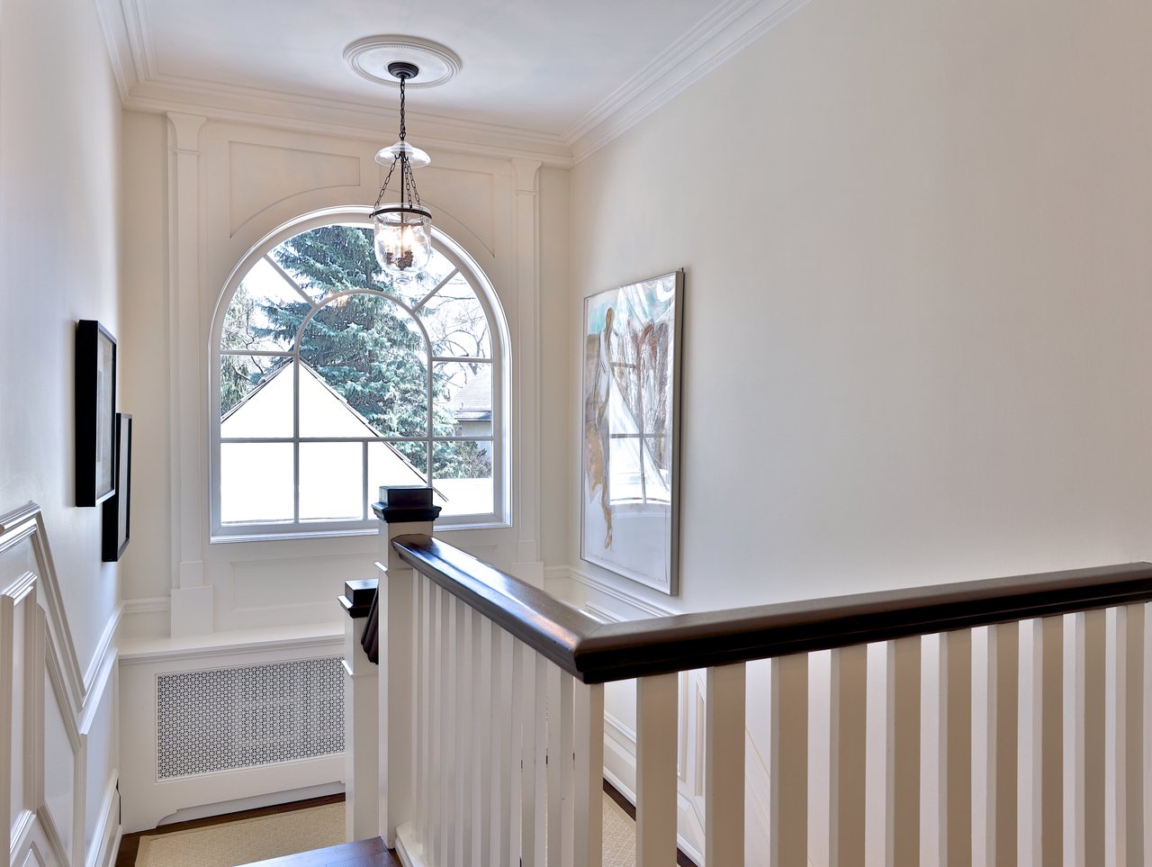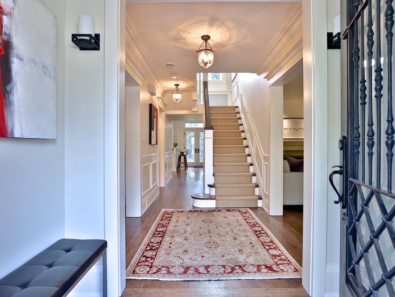 The Grand Hall features wide plank reclaimed elm hardwood floor, crown molding, light fixtures, a double cloak closet, wainscoting, archways opening onto principal rooms and a traditional staircase with a broadloom runner, wood handrail and white pickets.