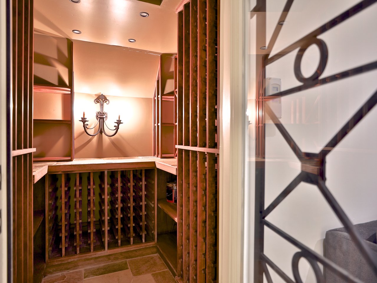 The temperature controlled Wine Cellar features a light sconce, pot lights, tile floor, a slate countertop and custom wine shelving.