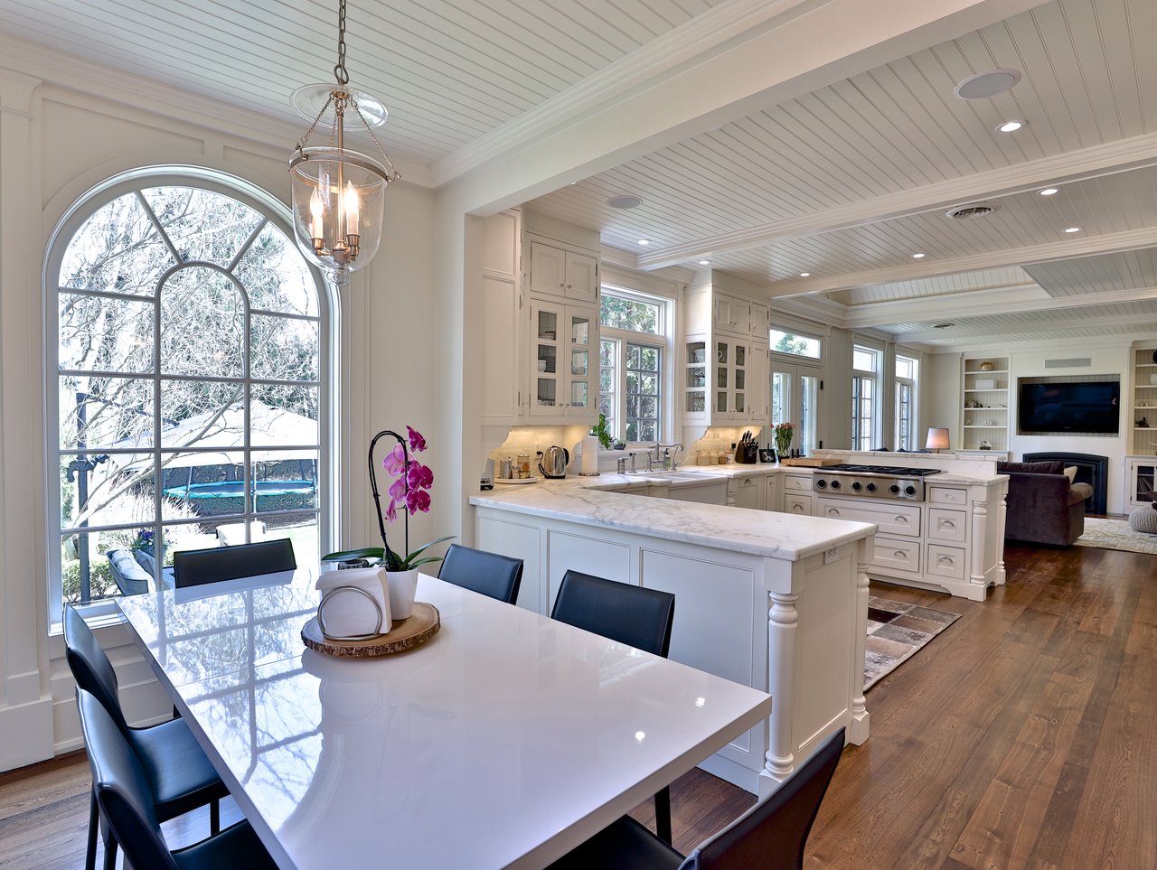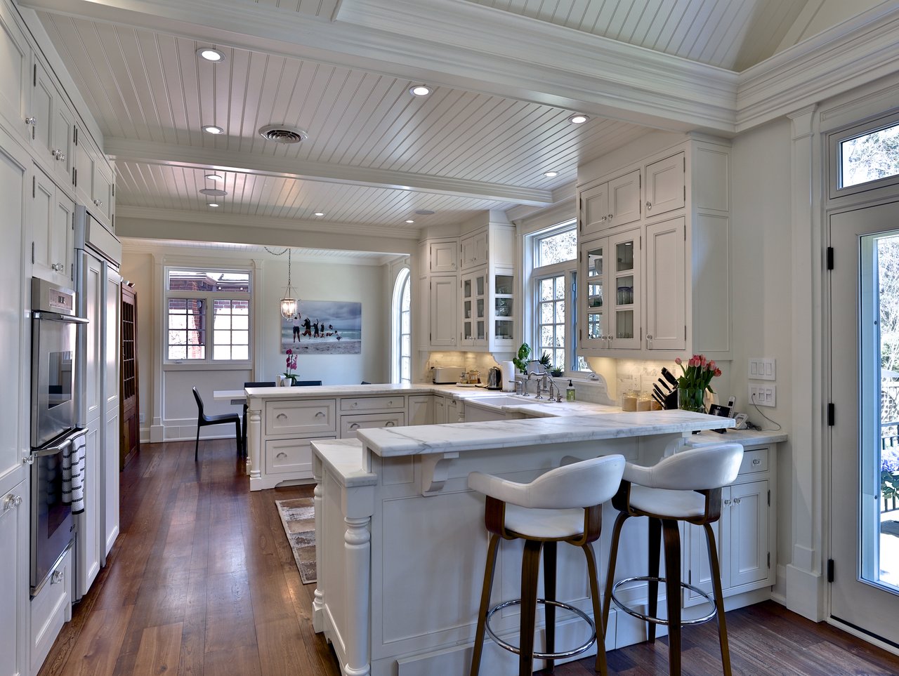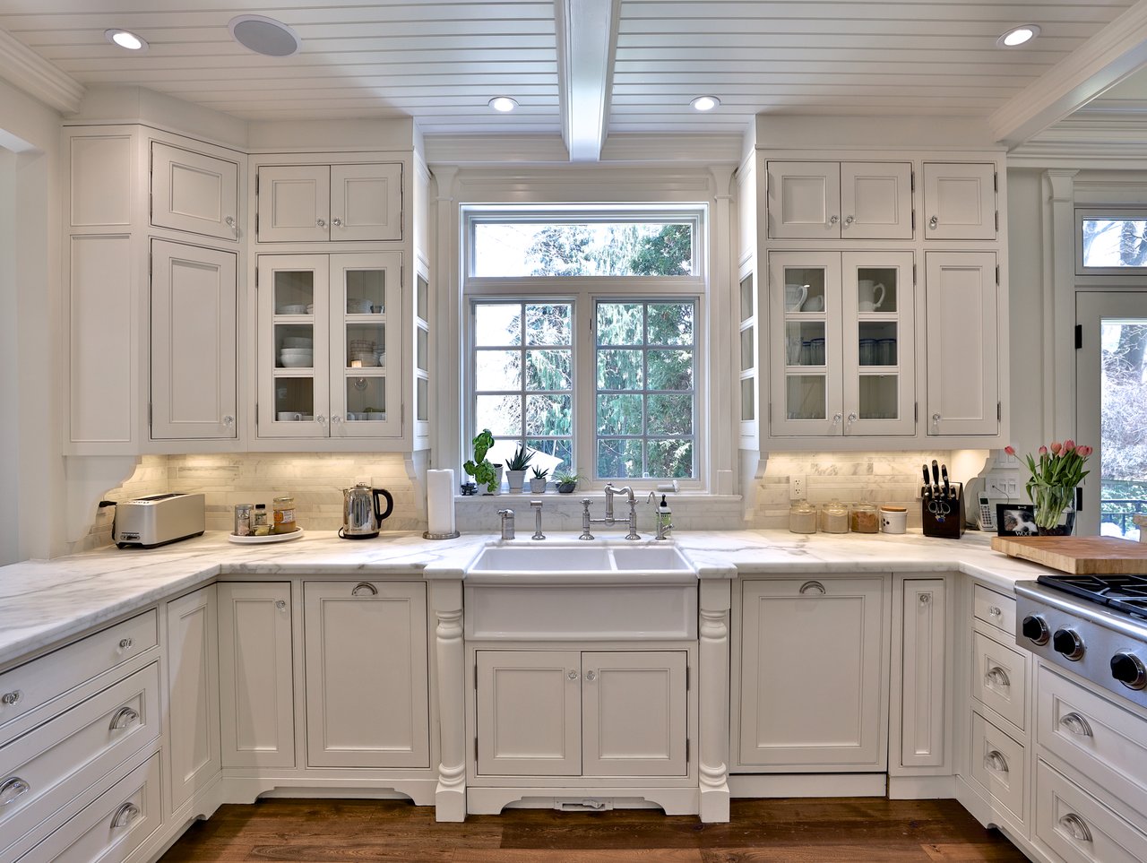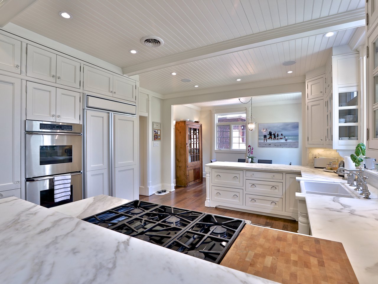 The Gourmet, chef inspired Kitchen, open in design to the Breakfast Area and Family Room, features wide plank reclaimed elm hardwood floor, crown molding, pot lights, vaulted ceiling, bead board paneled ceiling, built-in speakers, pull out spice racks, custom designed and crafted floor-to-ceiling framed cabinetry, solid wood cabinetry, dove tailing, soft closing drawers, honed Calcutta marble breakfast bar and countertop, under valence lighting, open display shelving, several glass front cabinets, a window overlooking the rear gardens, garbage and recycling pull out, a dual bowl farmhouse style sink with a filtered water tap and veggie sprayer. The Kitchen also features pantry cabinets and a pair of doors opening onto the terrace and gardens.