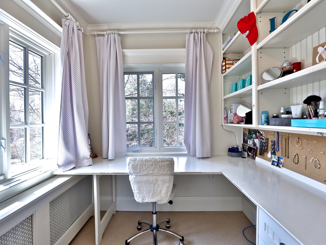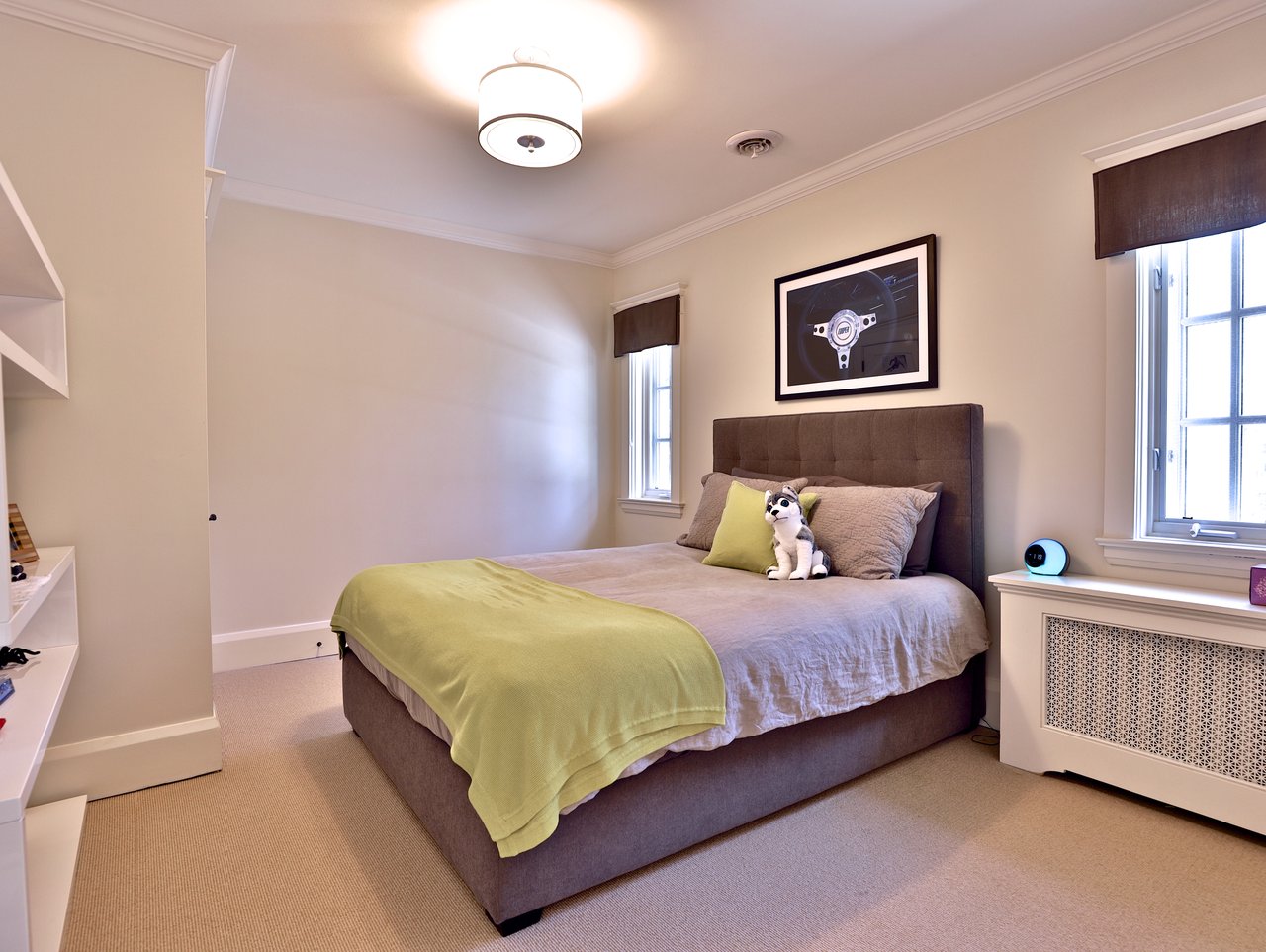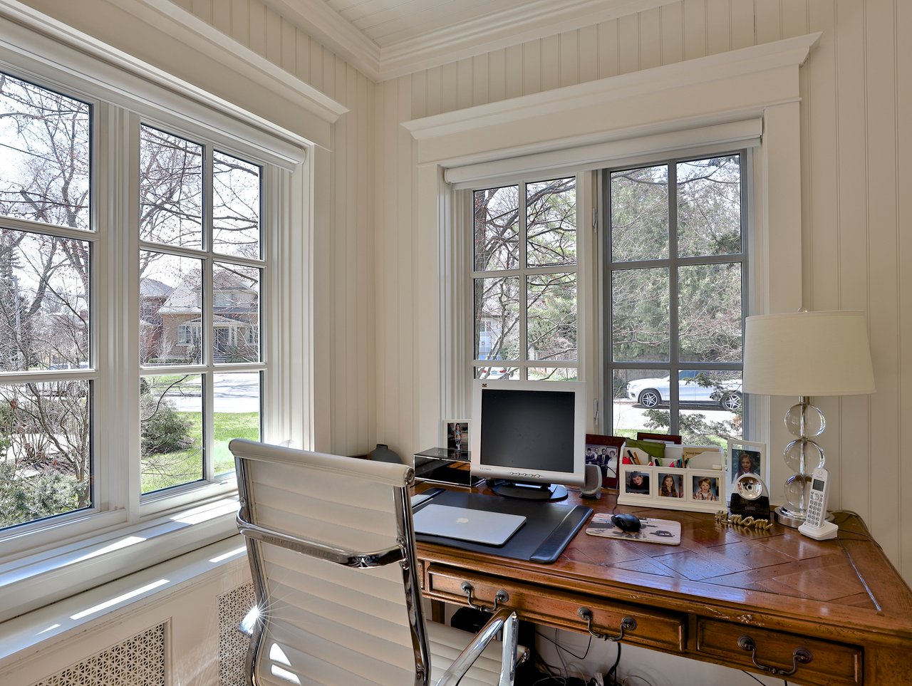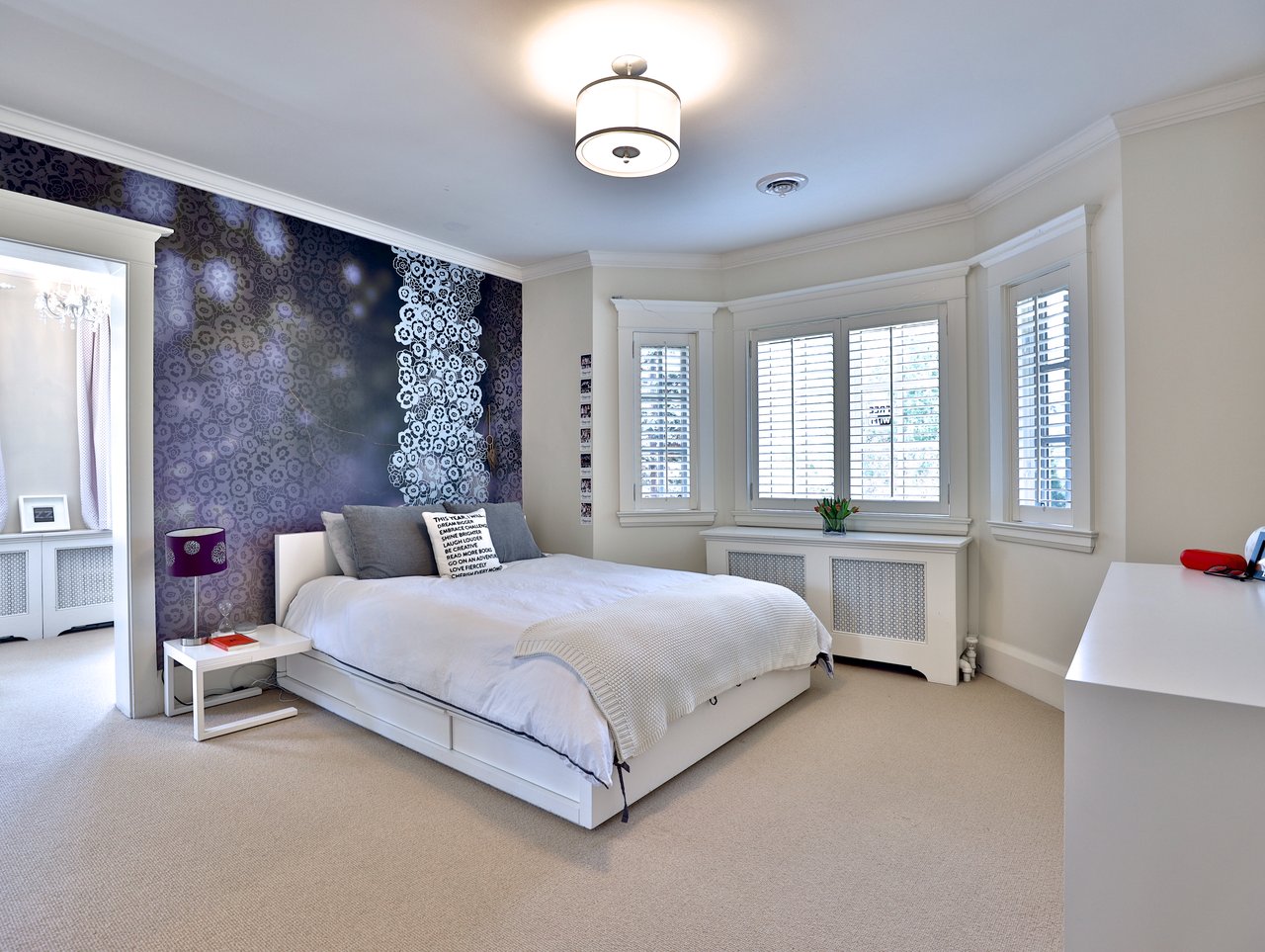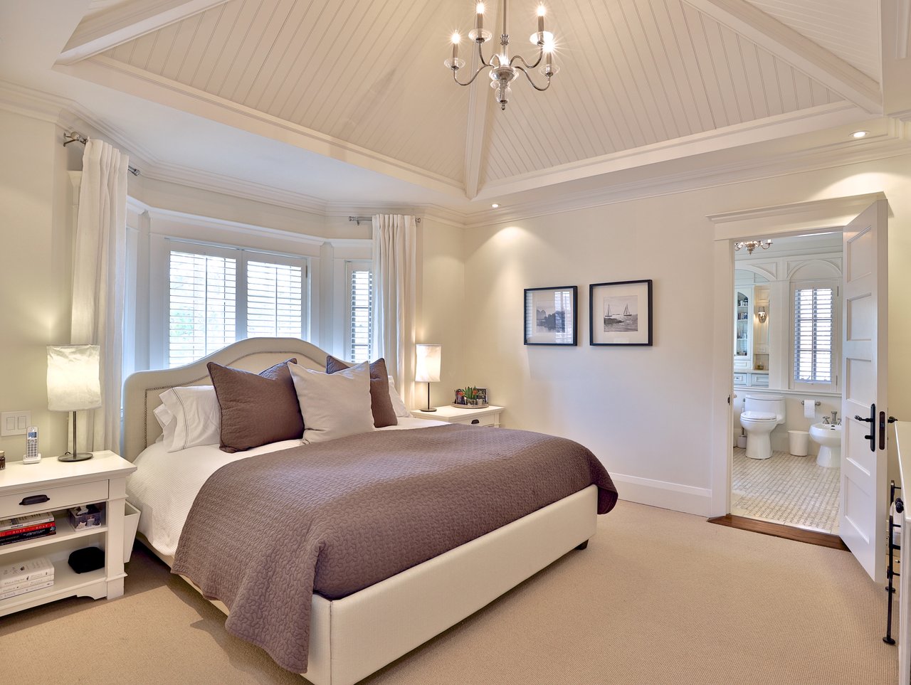 The private Master Bedroom features a walk-in closet, a 9-piece ensuite, broadloom floor, bead board paneled ceiling, chandelier, vaulted soaring ceiling, a Bay window outfitted with California shutters and custom drapery overlooking the front gardens and a custom built-in unit complete with patina mesh front cabinets.