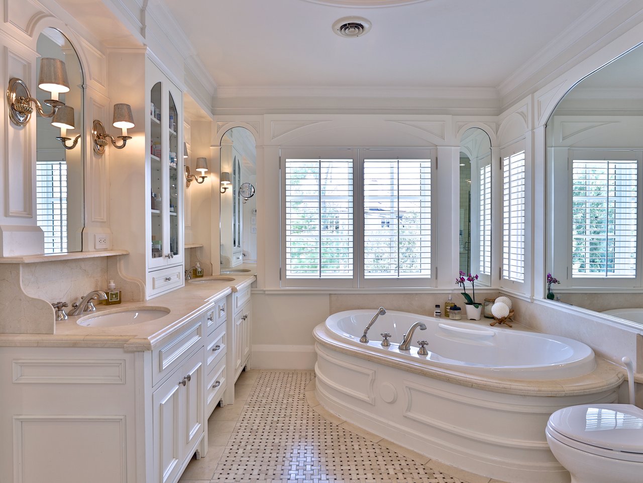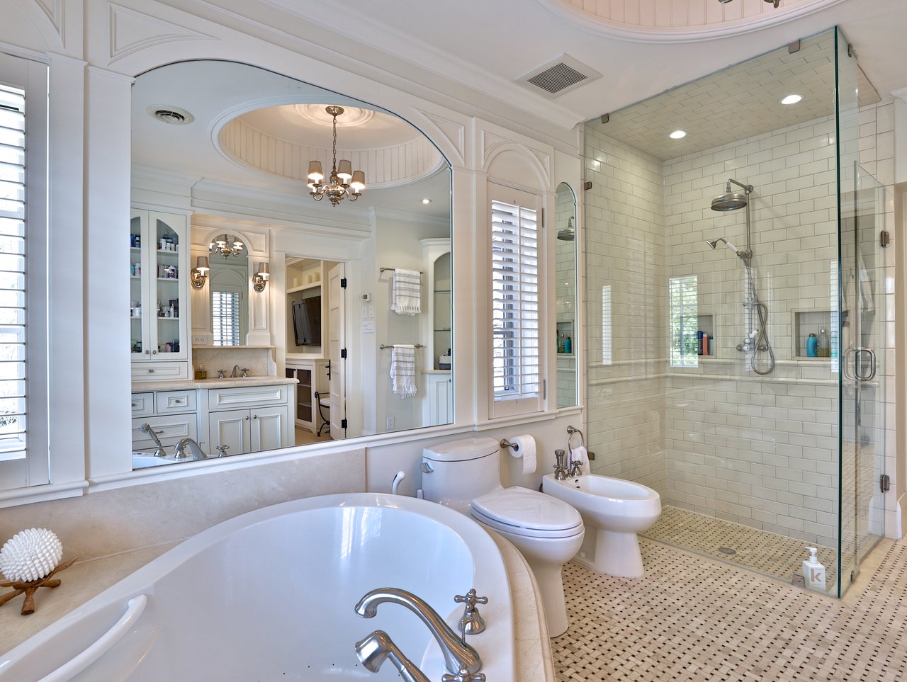 The luxurious 9-piece ensuite features heated limestone floor laid in a basket weave pattern, crown molding, a pocket door opening onto the walk-in closet, glass shelving, chandelier medallion, a coffered circular ceiling design, light sconces, a custom vanity with “His” and “Hers” under mount sinks, limestone countertop and backsplash, medicine cabinet, two framed mirrors, windows outfitted with California shutters overlooking the front and side gardens, a deep soaker Ultra jet tub with a limestone surround and a seamless glass shower with a tile surround, “His” and “Hers” soap boxes, basket weave floor, handheld faucet and a rain shower head.