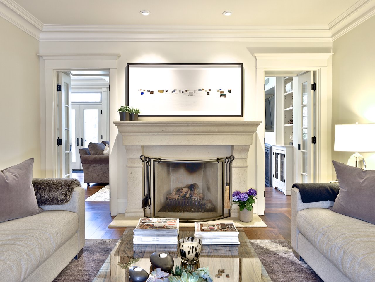 The Mudroom features heated limestone floor, pot lights, crown molding, a custom built-in bench, a double cloak closet, a walk out to the side gardens and an antique fireplace mantle.