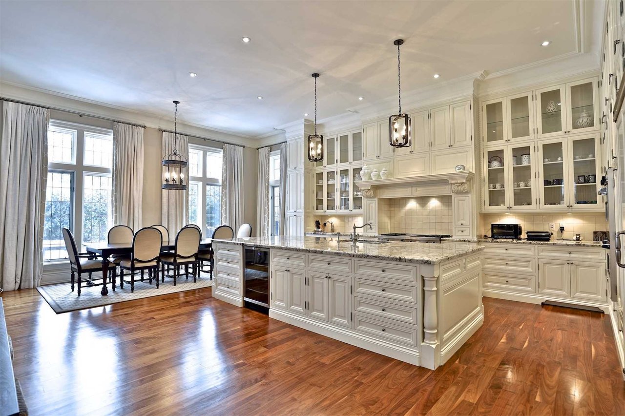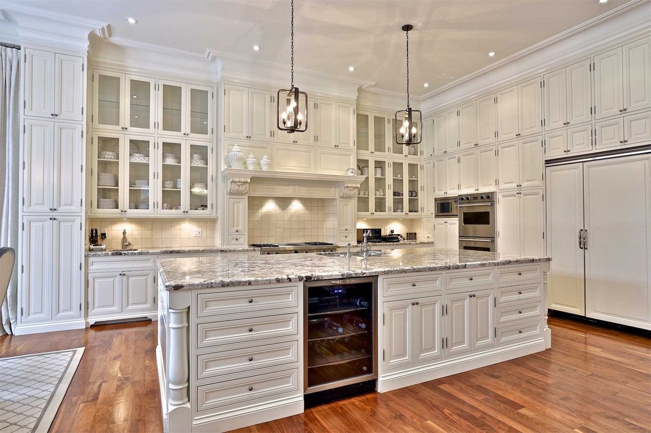 The Gourmet, chef inspired Kitchen, entered through an archway off of the Great Hall and open in design to the Breakfast Area and Family Room, features hardwood floors, crown molding, pot lights, granite countertop, floor-to-ceiling custom designed and crafted framed cabinetry, several glass front display cabinets, solid wood soft closing drawers, tile backsplash, under valence lighting, a professional hood fan, decorative corbles, a stainless steel under mount Franke sink, an array of leaded windows outfitted with custom drapery overlooking the rear gardens and an oversized center island boasting a wine refrigerator and a stainless steel under mount sink with a veggie sprayer.
