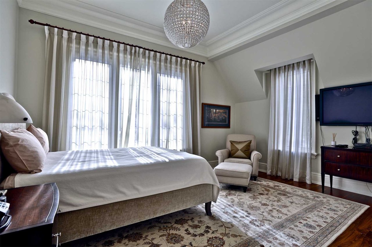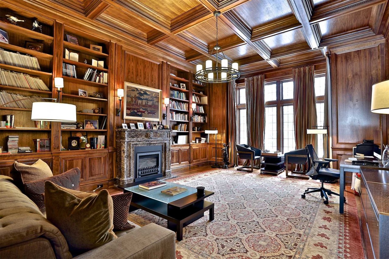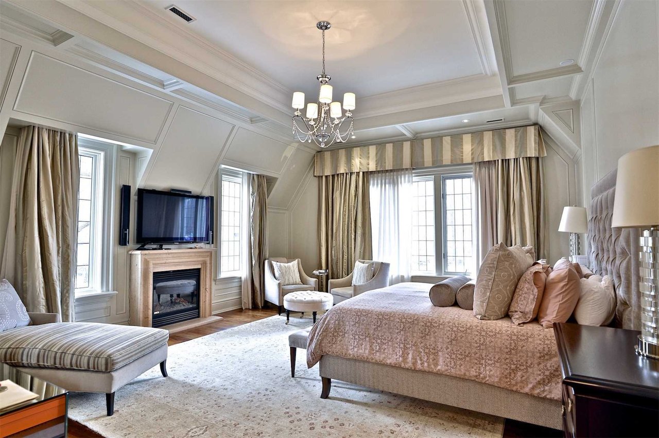 The Master Bedroom features an Anteroom, “His” and “Hers” Dressing Rooms, a luxurious 10-piece ensuite bath, hardwood floor, coffered ceiling, chandelier, detailed border ceiling molding, built-in speakers, floor-to-ceiling recessed paneled walls, leaded windows outfitted with custom drapery overlooking the rear and side gardens, a gas fireplace with a precast mantle and custom built-in open display shelving and closed cabinets.