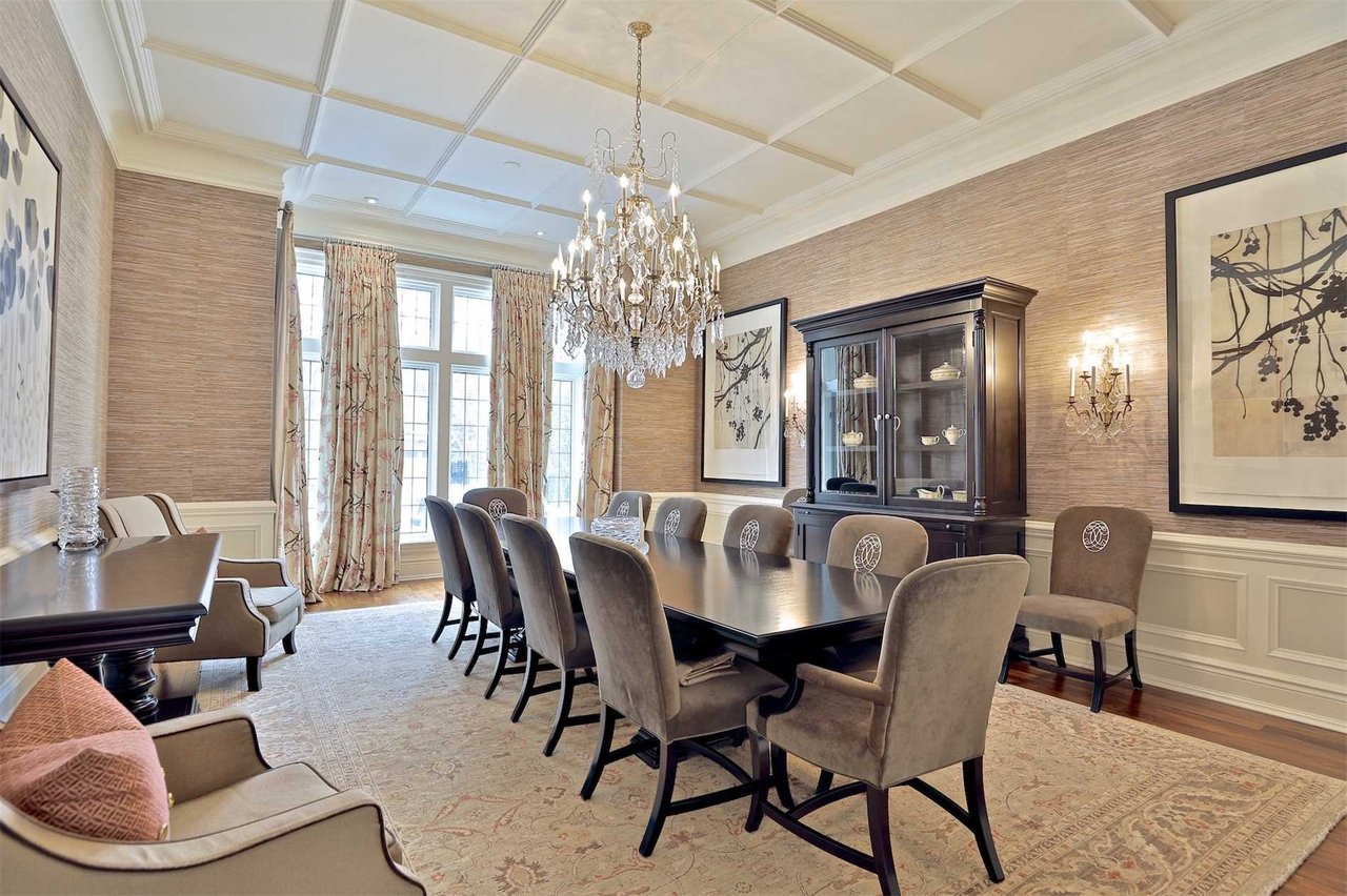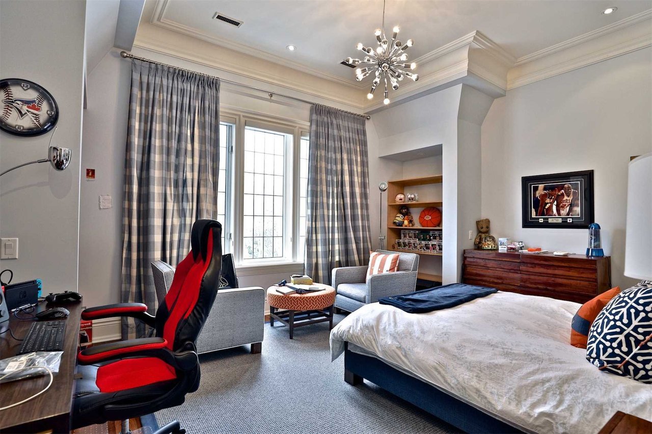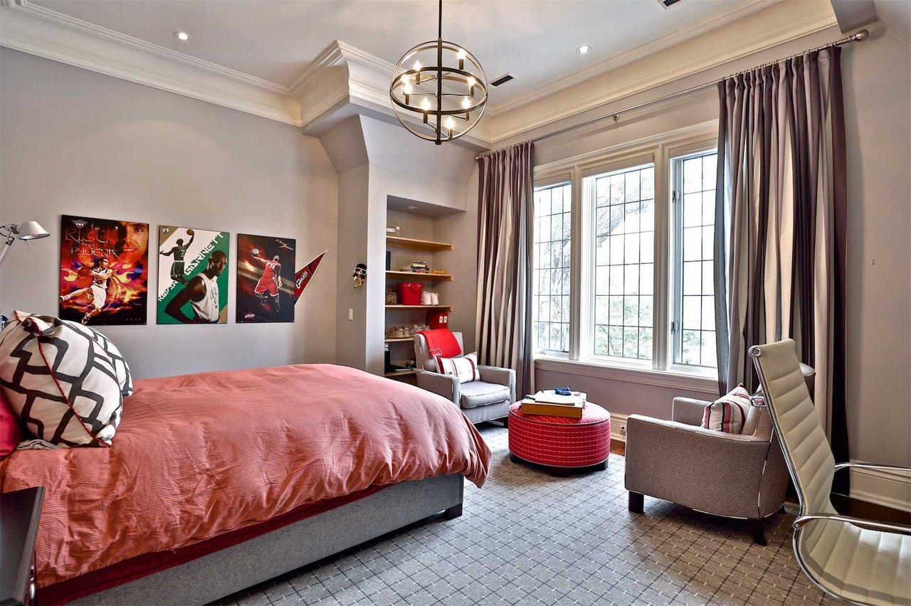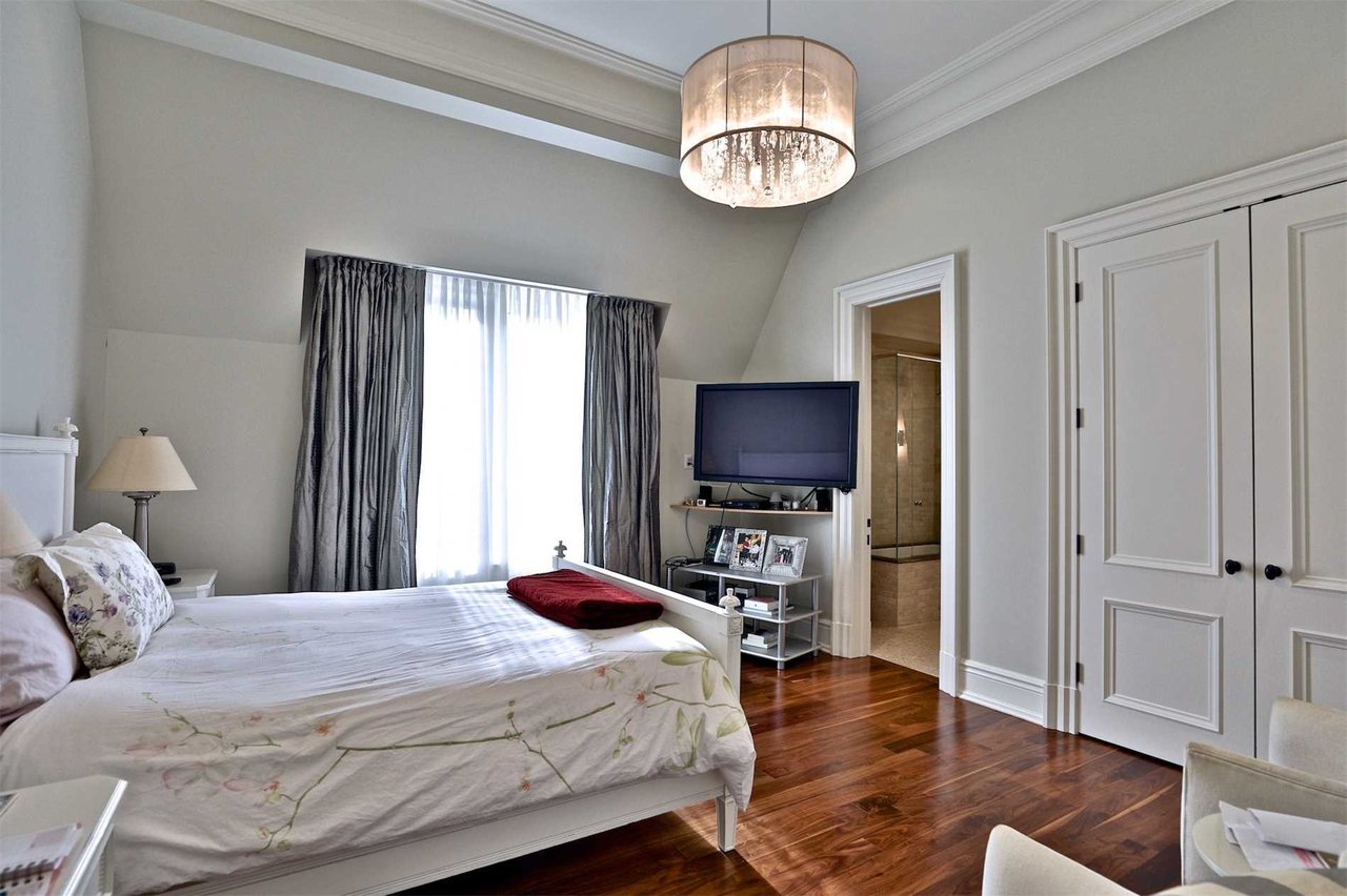 The Master Bedroom features an Anteroom, “His” and “Hers” Dressing Rooms, a luxurious 10-piece ensuite bath, hardwood floor, coffered ceiling, chandelier, detailed border ceiling molding, built-in speakers, floor-to-ceiling recessed paneled walls, leaded windows outfitted with custom drapery overlooking the rear and side gardens, a gas fireplace with a precast mantle and custom built-in open display shelving and closed cabinets.