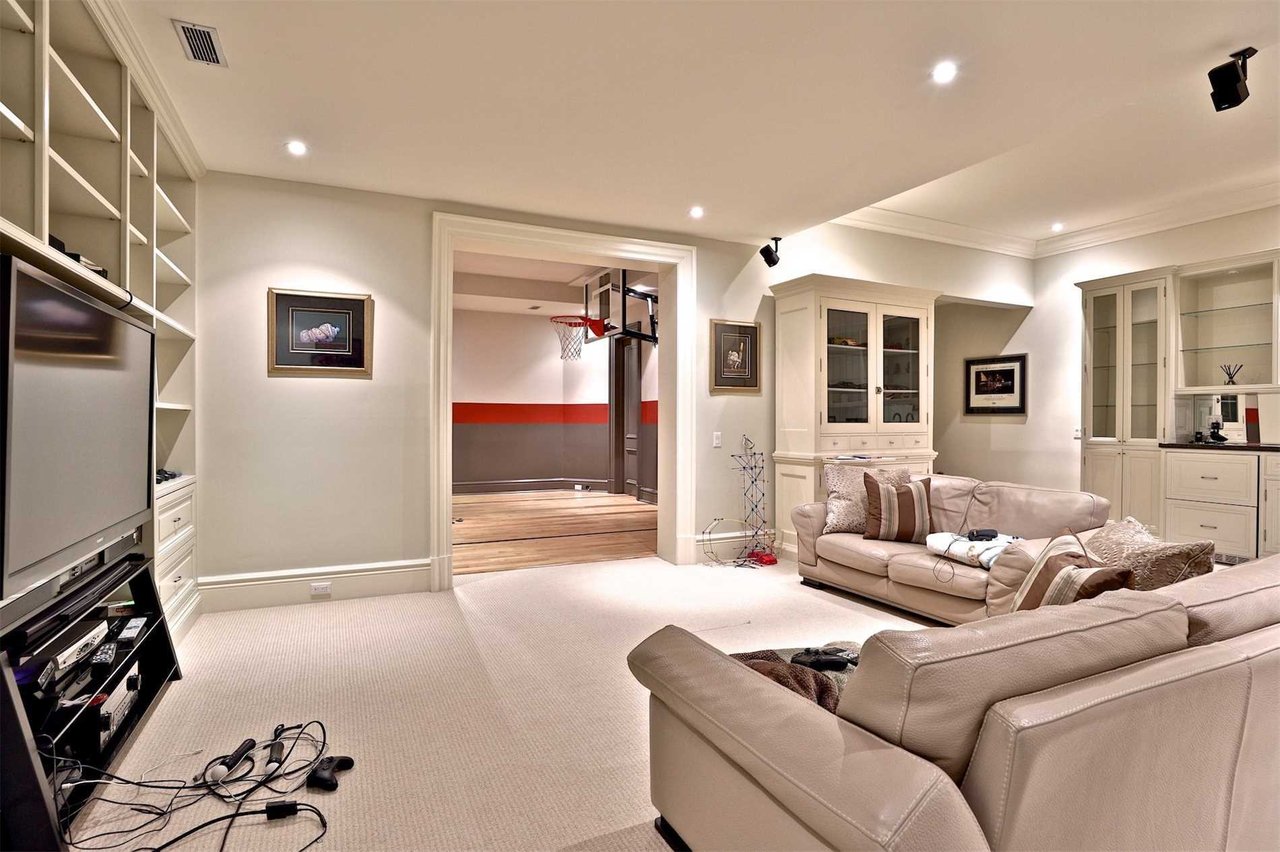The Recreation Room, open in design to the Wet Bar, features broadloom floor, crown molding, pot lights, built-in speakers and a custom designed and crafted built-in unit comprised of closed cabinets and open display shelving.