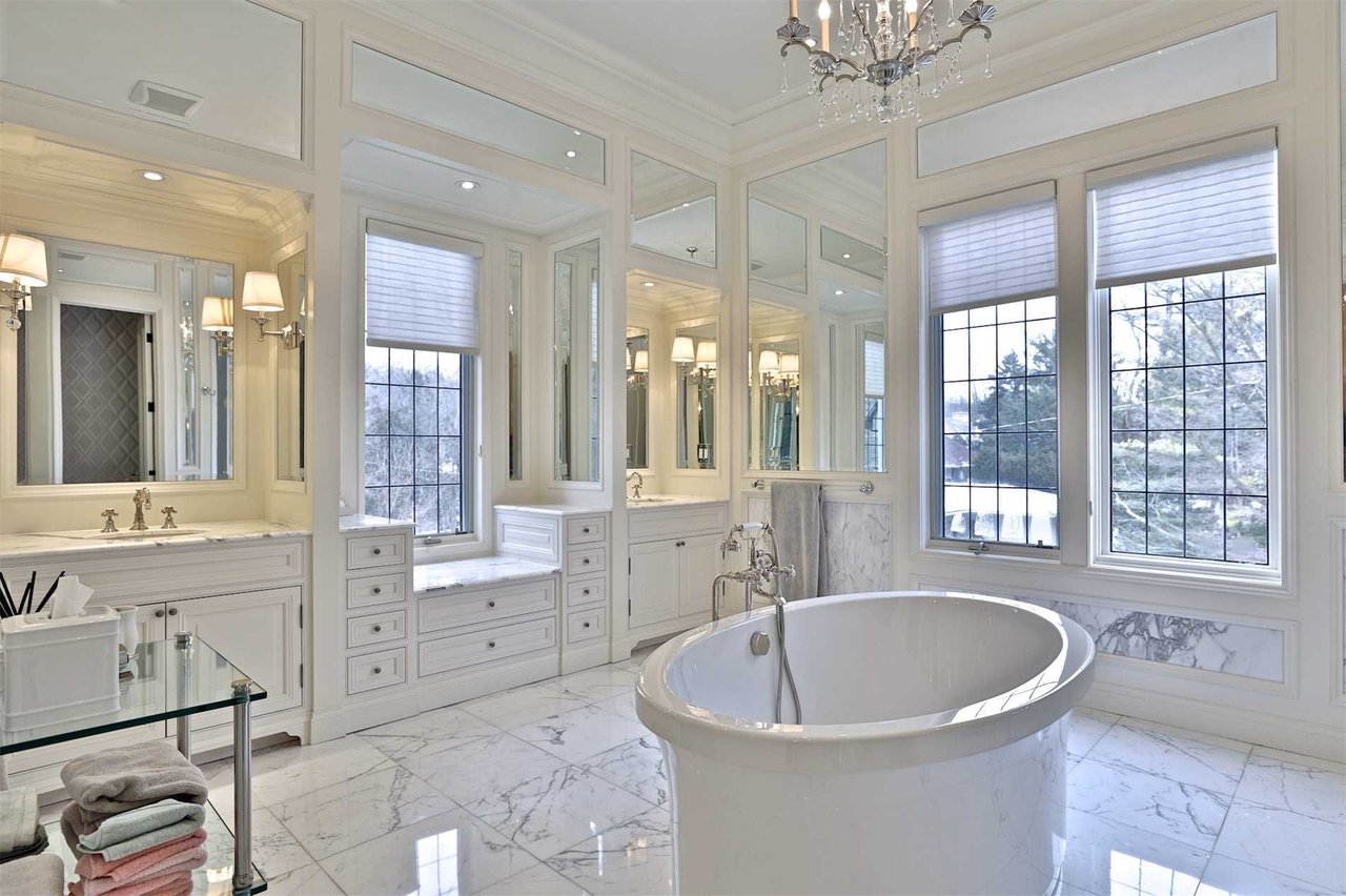 The luxurious 10-piece ensuite bath features heated marble floor, pot lights, crown molding, chandelier, floor-to-ceiling recessed paneled walls with mirror and marble inlay, light sconces, “His” and “Hers” separate custom vanities complete with under mount sink and marble countertop, framed beveled mirrors, a marble bench, leaded windows outfitted with custom drapery overlooking the front and side gardens, a separate water closet housing the toilet and bidet and an expansive seamless glass shower complete with body jets, a steam unit, handheld faucet, Rain shower head, built-in bench and marble accents.