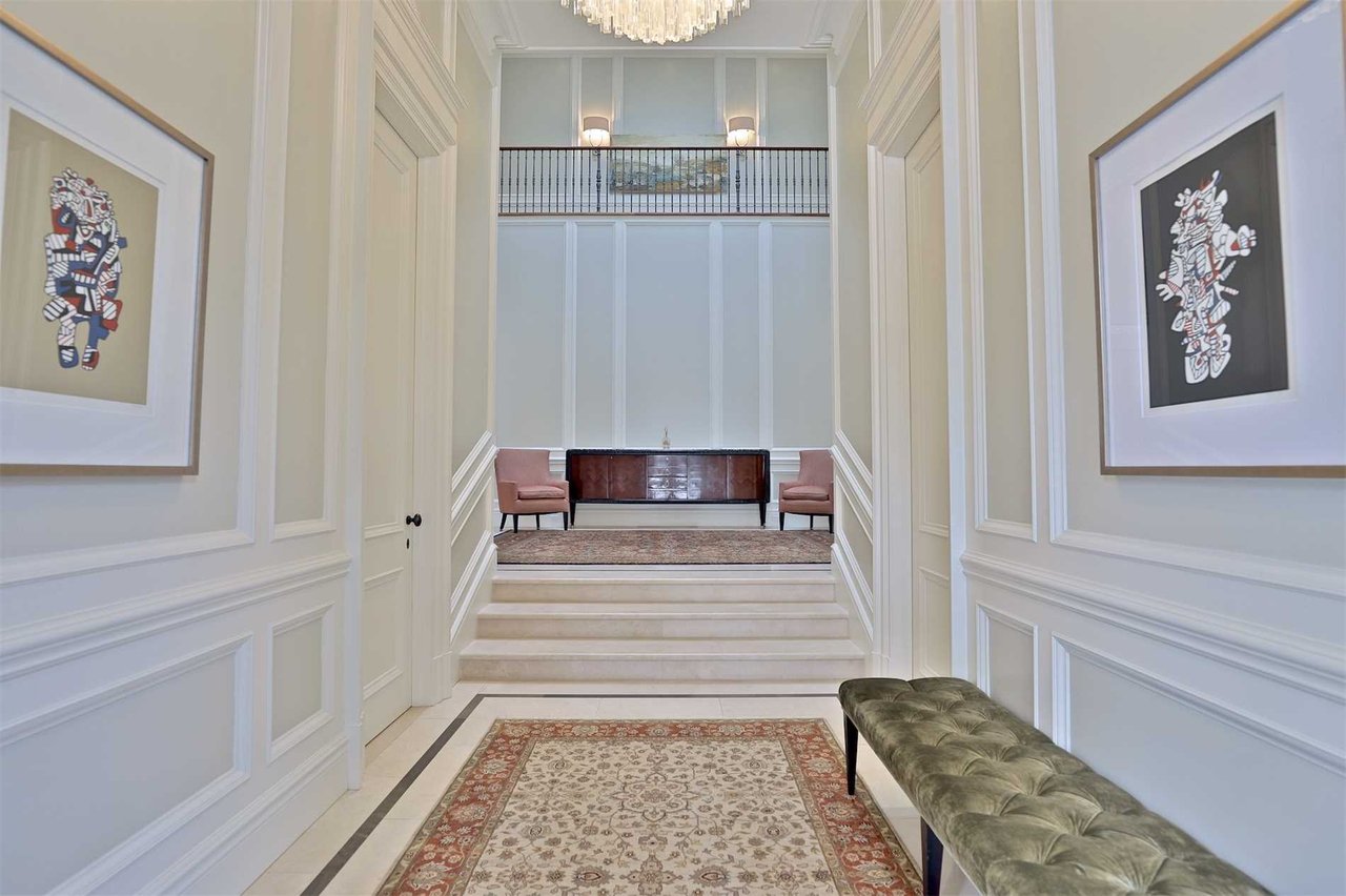 The Foyer, sunken in design, features a solid wood entry door with leaded glass sidelights, alarm pad, heated marble floor with a contrasting border, crown molding, pot lights, chandelier, floor-to-ceiling recessed paneled walls, a walk-in cloak closet and steps leading up to the Great Hall.