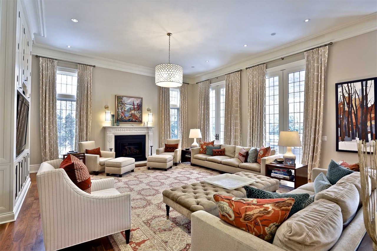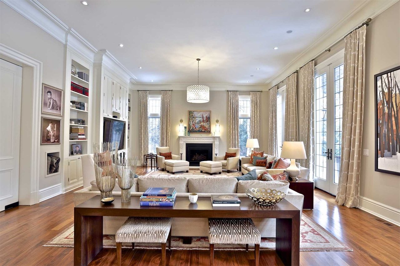 The Family Room, open in design to the Kitchen and Breakfast Area and entered through an archway off of the Great Hall, features hardwood floor, crown molding, a light fixture, a swing door opening from the Servery, pot lights, two sets of French doors outfitted with custom drapery opening onto the rear gardens, leaded windows outfitted with custom drapery overlooking the side gardens, a gas fireplace with a carved marble mantle, light sconces and custom designed and crafted built-in framed cabinets comprised of open display shelving, closed cabinets and patina mesh front cabinets.