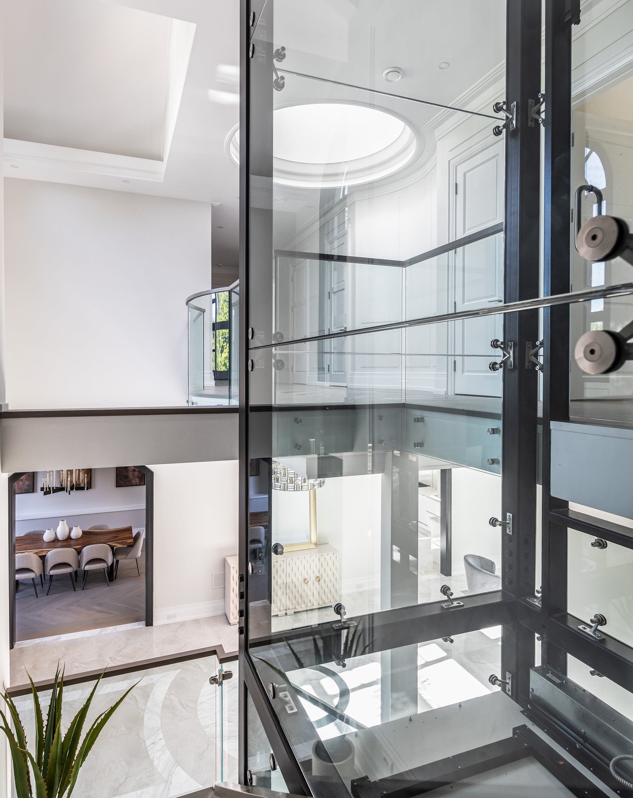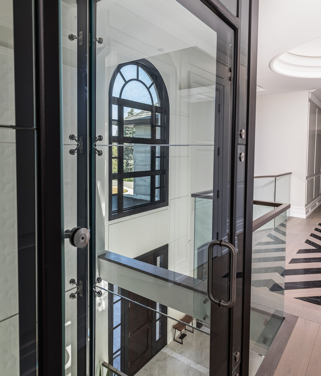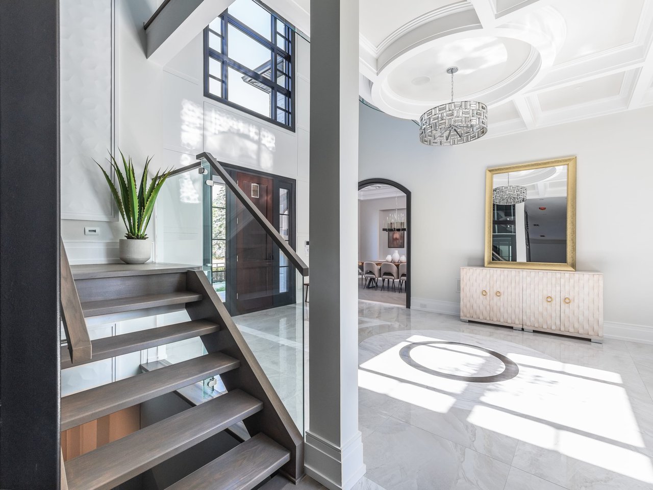FoyerThe stunning Foyer features a heated floor, upper valence window, access to the glass elevator, pot lights, cathedral ceiling, a solid wood door with sidelights, barrel ceiling detail, built-in speakers, crown molding, a light fixture, archways opening to the principal rooms and an offside open riser staircase with a glass and steel railing.