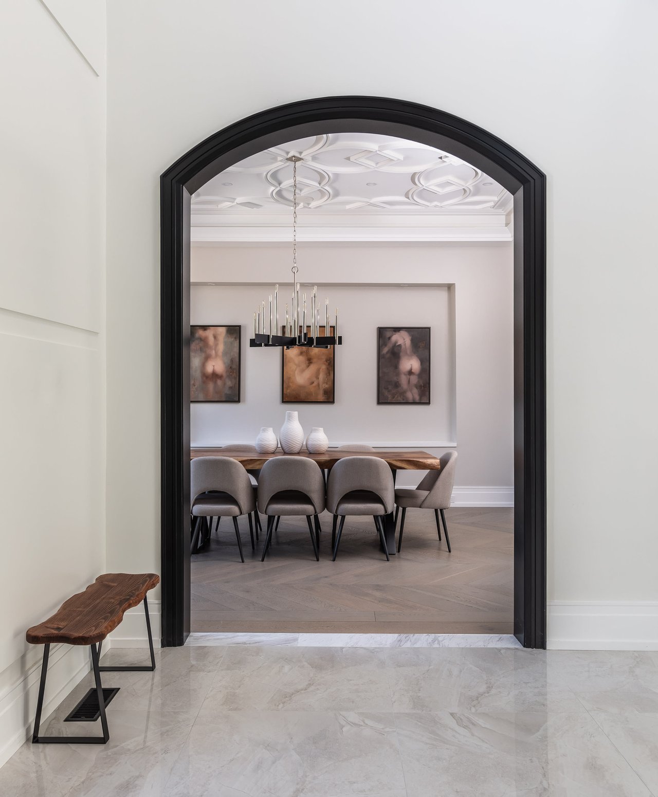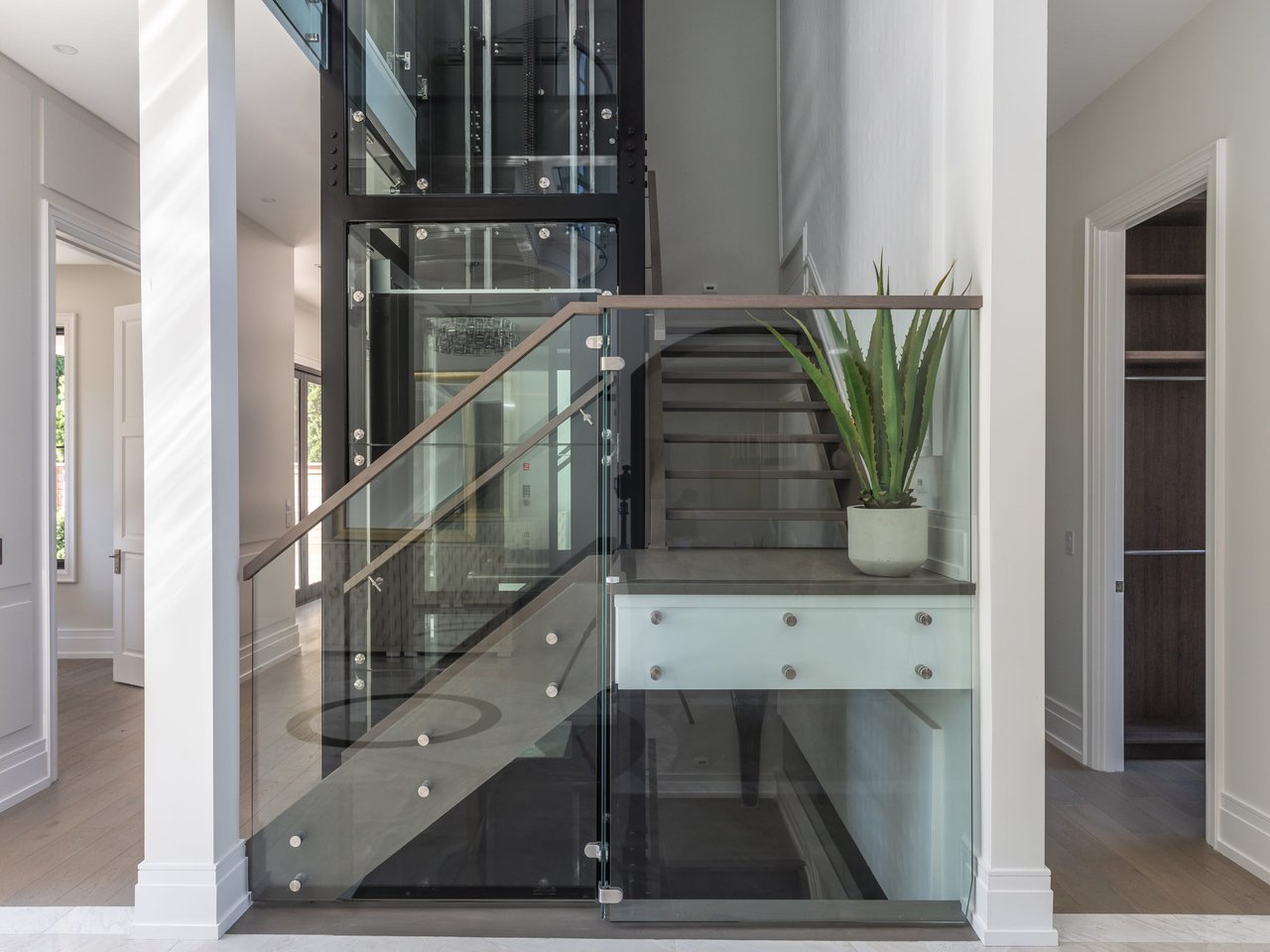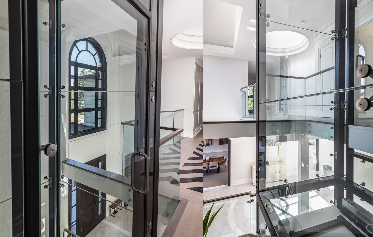 FoyerThe stunning Foyer features a heated floor, upper valence window, access to the glass elevator, pot lights, cathedral ceiling, a solid wood door with sidelights, barrel ceiling detail, built-in speakers, crown molding, a light fixture, archways opening to the principal rooms and an offside open riser staircase with a glass and steel railing.