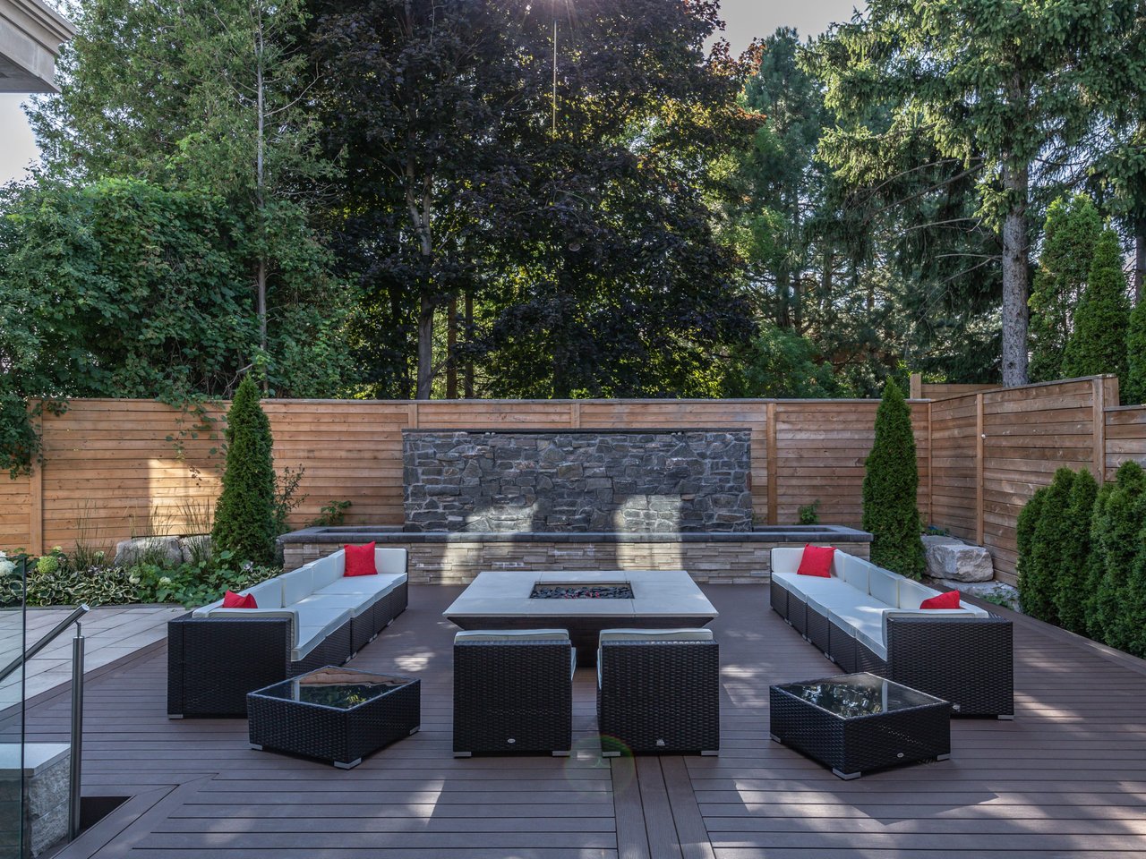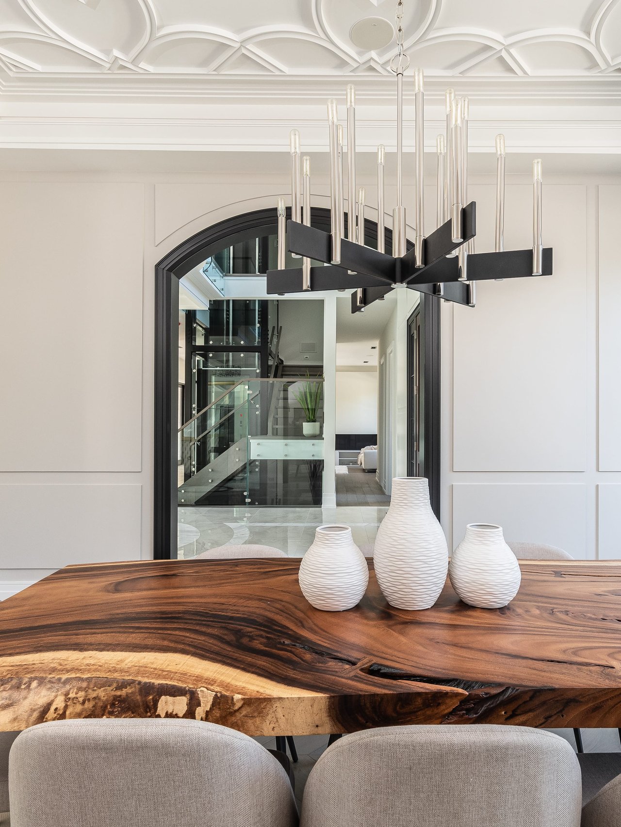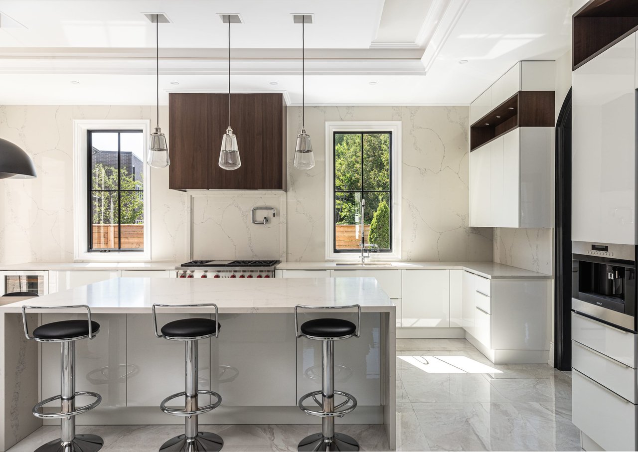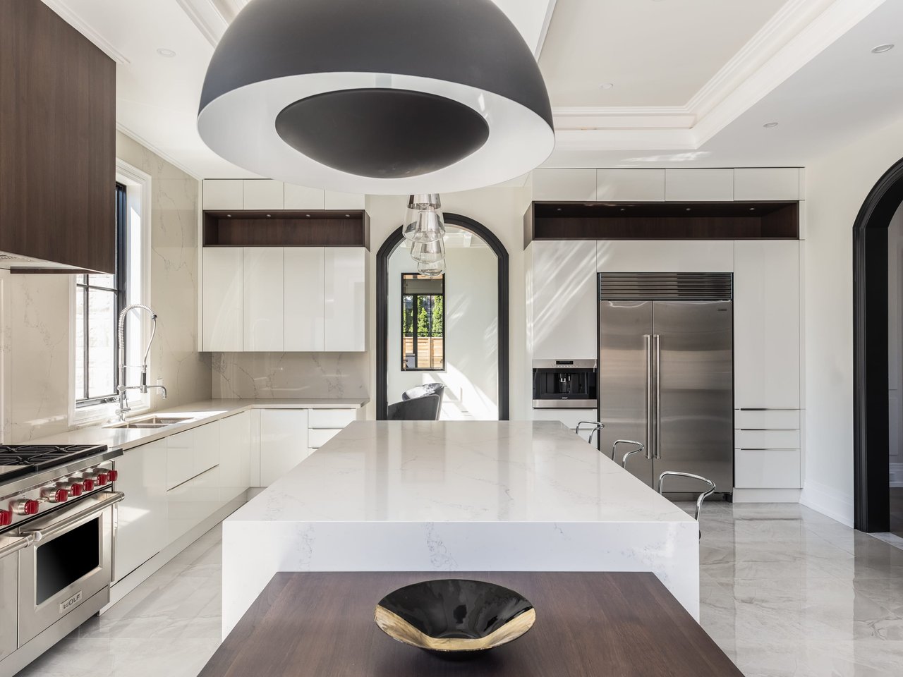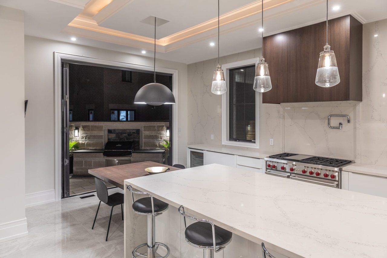 The Gourmet, chef-inspired Scavolini Kitchen, entered through an archway off of the Dining Room and Living Room, features heated floors, garbage and recycling pull out, coffered ceiling with drop center design, pendant lights, pot lights, floor-to-ceiling custom designed and crafted cabinetry, corner magic drawer, central vacuum kick sweep, soft-closing drawers, custom drawer inserts, pot filler, quartz countertop and backsplash, expansive stainless steel under-mount sink complete with an industrial faucet, a California accordion door opening onto the rear gardens and terrace, professional hood fan, windows overlooking the rear gardens, a custom built-in dining table, ample storage and an expansive center island complete with a waterfall island and breakfast bar.
