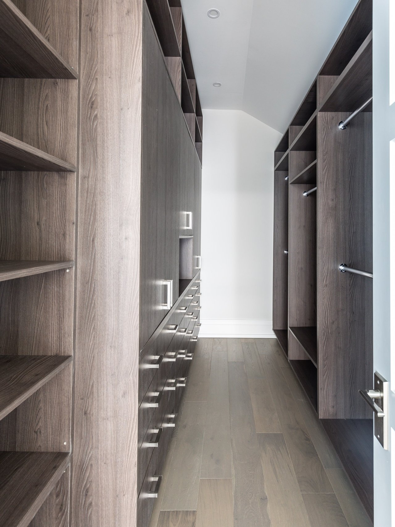 His Dressing Room, features pot lights, hardwood floor, custom cabinetry, long hanging and short hanging capabilities, and open display shelving.