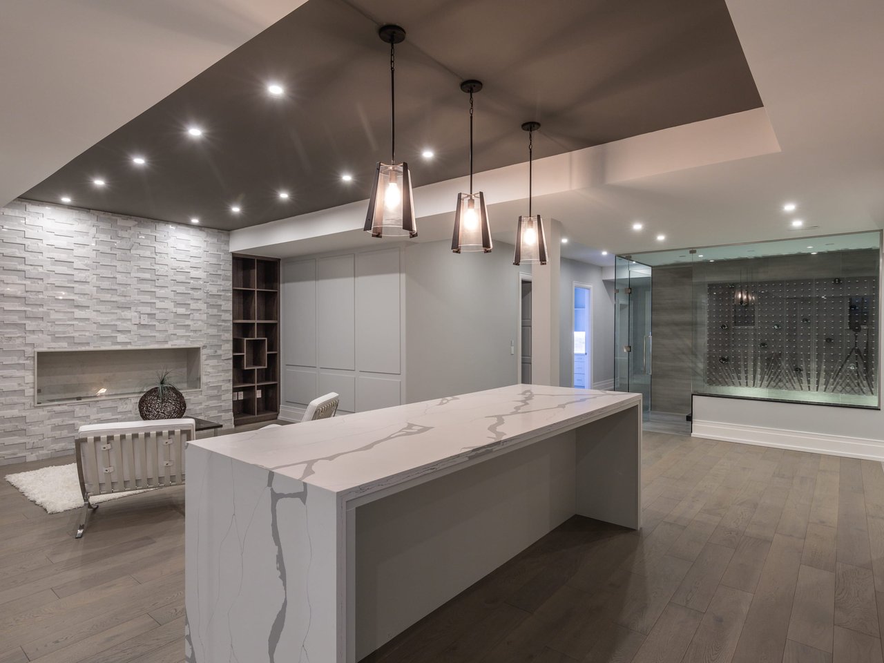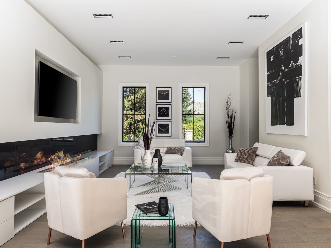 The Library, entered through a pair of doors, features heated oak hardwood floor, rope lighting, center drop ceiling design, built-in speakers, pot lights, windows overlooking the rear gardens, a double-sided fireplace, and custom-designed and crafted cabinetry comprised of open shelving and closed cabinets.