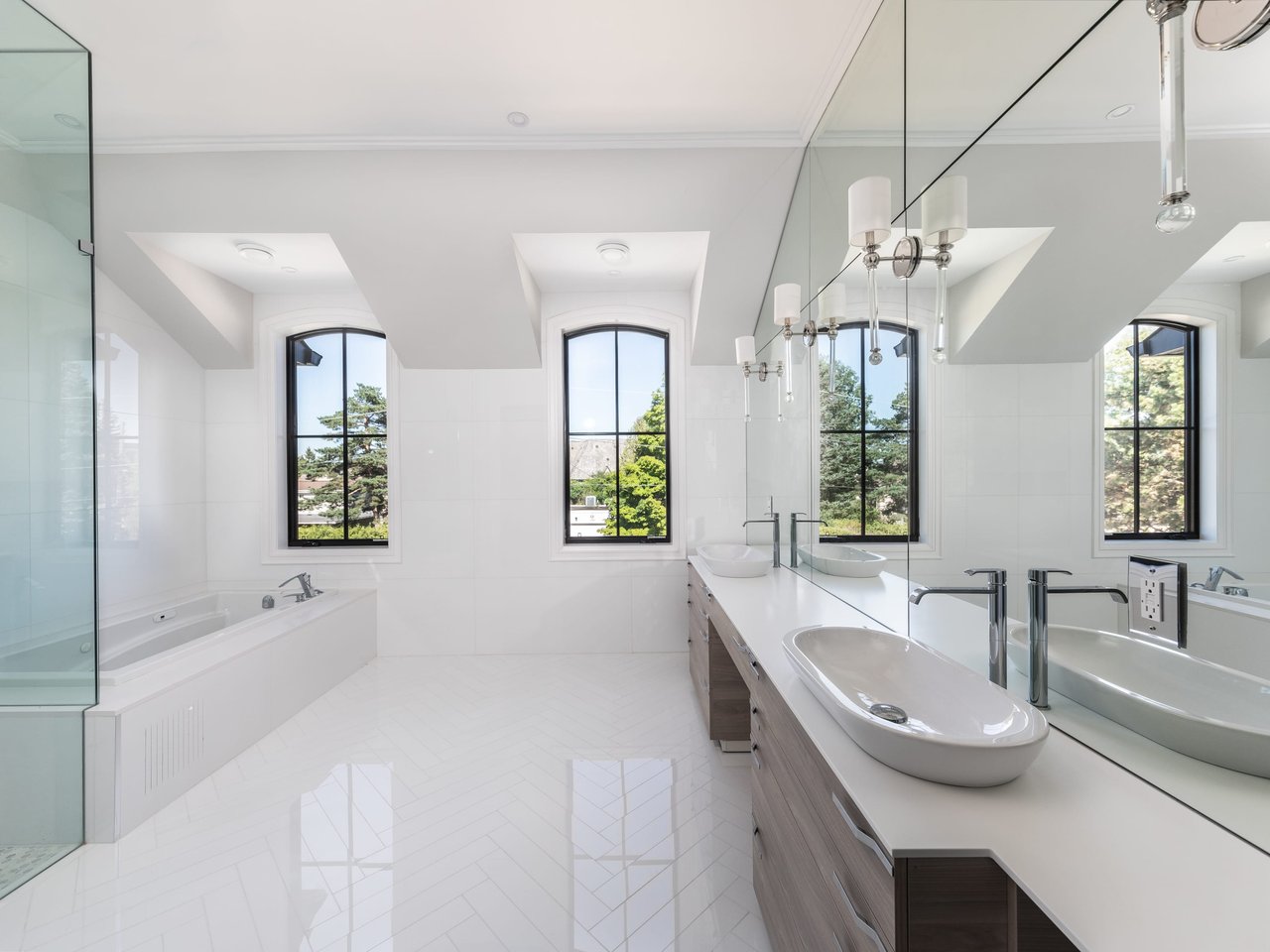 The opulent 8-piece marble ensuite, features heated floor laid in a herringbone pattern, pot lights, crown molding, a window overlooking the front gardens, custom built-in storage, a mirror, light sconces, tile walls, a Maax jet tub, an expansive seamless glass shower flush with the floor complete with a soapbox, handheld faucet, rain shower head, and marble tile floor. The ensuite also features a water closet housing the toilet, an expansive custom Scavolini vanity complete with open shelving, and “His” and “Hers” vessel sinks.