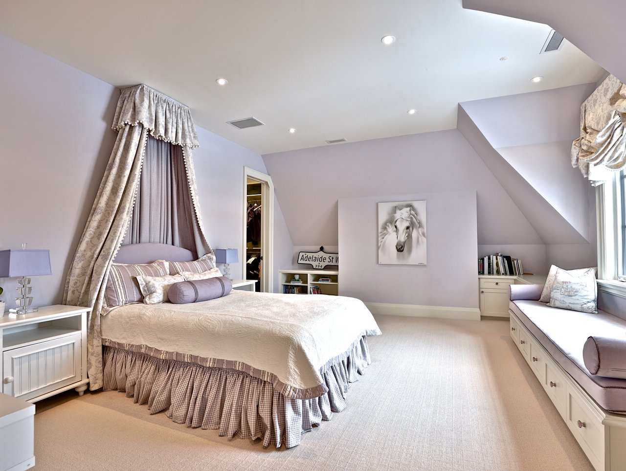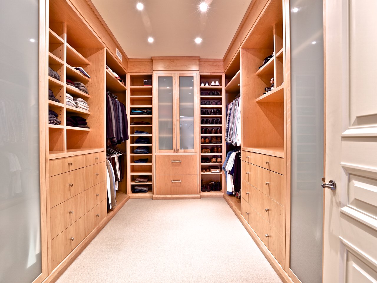 Her Expansive Dressing Room Features Wool Sisal Carpeting, Pot Lights, Custom Floor-To-Ceiling Light Birch Built-In Cabinetry With Frosted Glass Front Doors, An Integrated Mirror, Custom Shoe Shelving, Ample Closed Drawers And Custom Open Shelving.