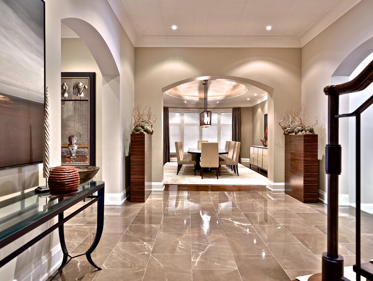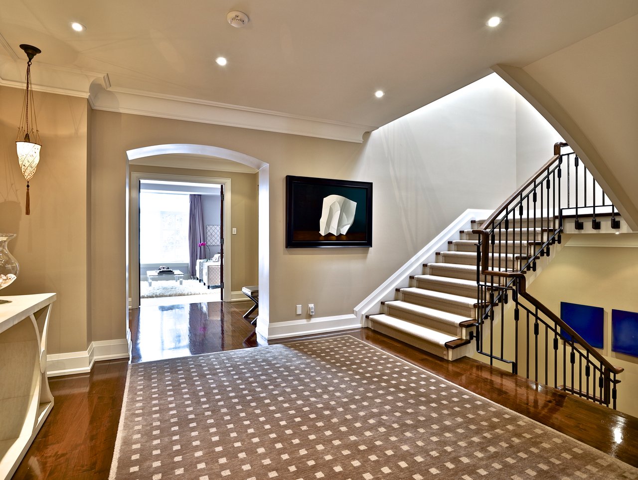 The Grand Hall, Steps Up From The Foyer, Features Heated Gris Pulpis Marble Floor, Crown Molding, Pot Lights, Built-In Speakers, Curved Archways Opening Onto The Principal Rooms, Cove Lighting, A Skylight And An Offside Oak Staircase Complete With A Wool Sisal Runner, Oak Wood Handrail And Custom Wrought Iron Railing.