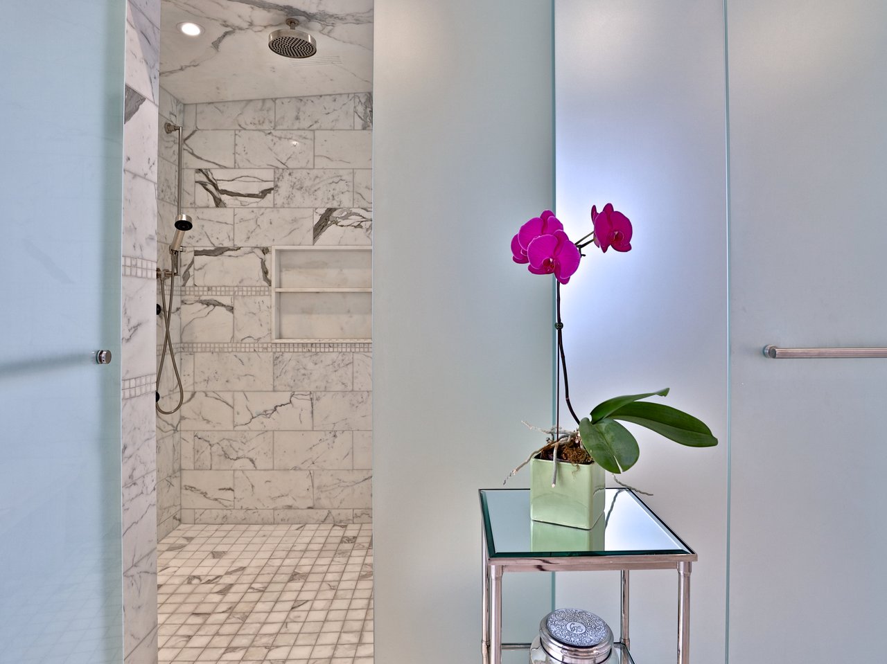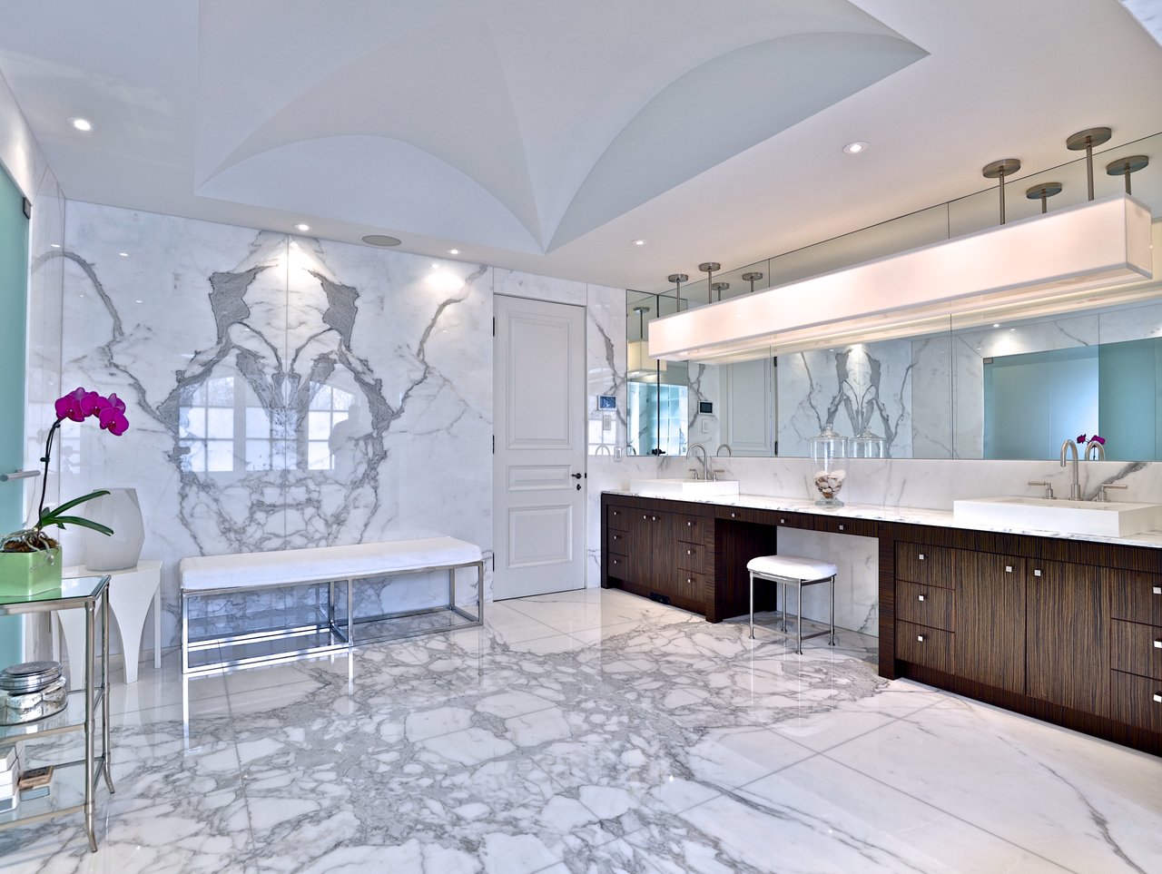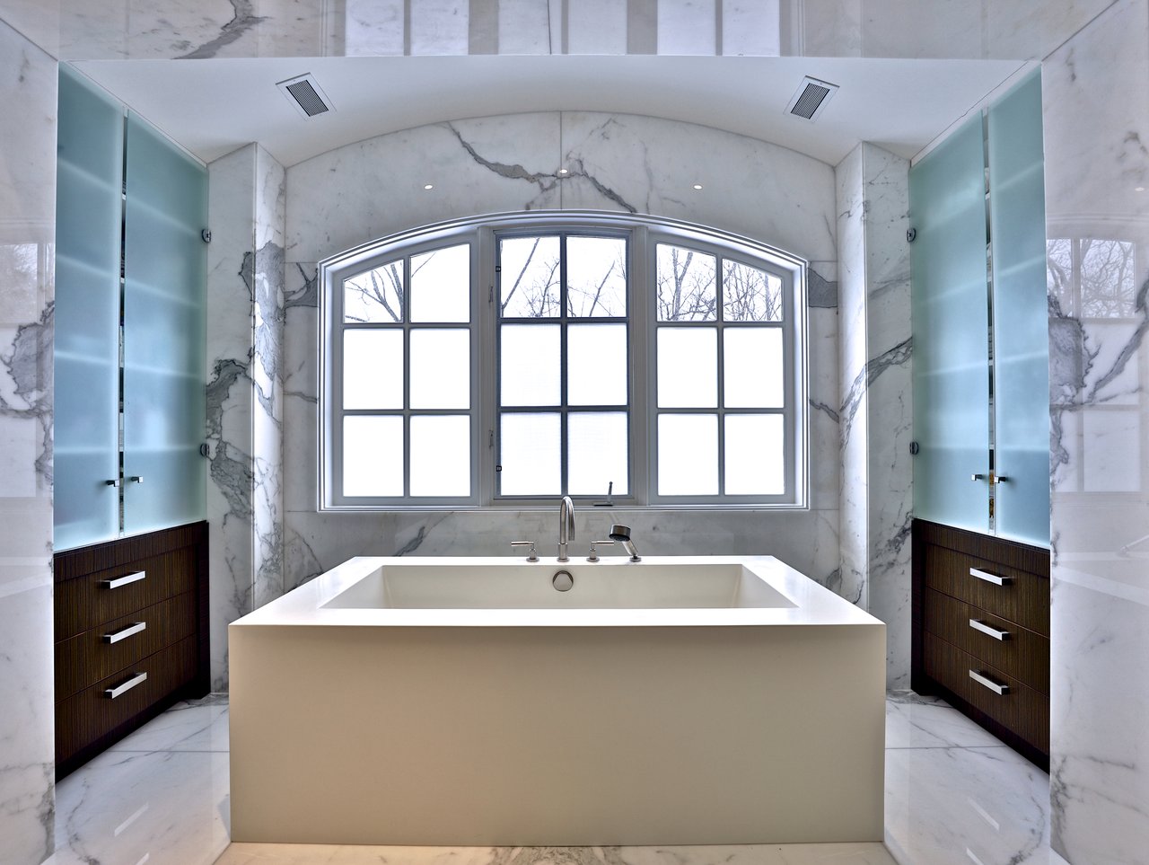 The Luxurious 9-Piece Book Matched Statuario Venato Marble Ensuite Bath, Features Heated Book Matched Statuario Venato Marble Floors, Custom Recessed Mirrored Medicine Cabinets, Pot Lights, Built-In Speakers, Groin Vaulted Ceiling, A Custom Designed Wall-To-Wall Macasar Ebony Vanity With “His” And “Hers” Square Matte White Vessel Sinks With Grohe Faucets, A Custom Makeup Area, Statuario Venato Marble Countertop, Custom 10’ Rectilinear Light Fixture With Plexiglass Shade, Book Matched Statuario Venato Marble Walls, A Water Closet Housing The Toilet, A Window Overlooking The Rear Gardens, Two Separate Custom Zebra Wood Built-In Cabinets With Frosted Glass Doors, An Expansive Seamless Glass Shower With A Marble Bench, Marble Surround, Soap Box, Handheld Faucet, Steam Unit, Body Jets And A Rain Shower Head. The Ensuite Also Features A Free Standing Deep Soaker Matte White Cube Tub With A Faucet And Handheld Sprayer.