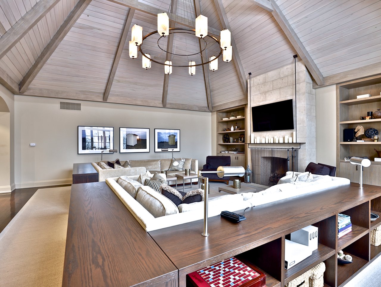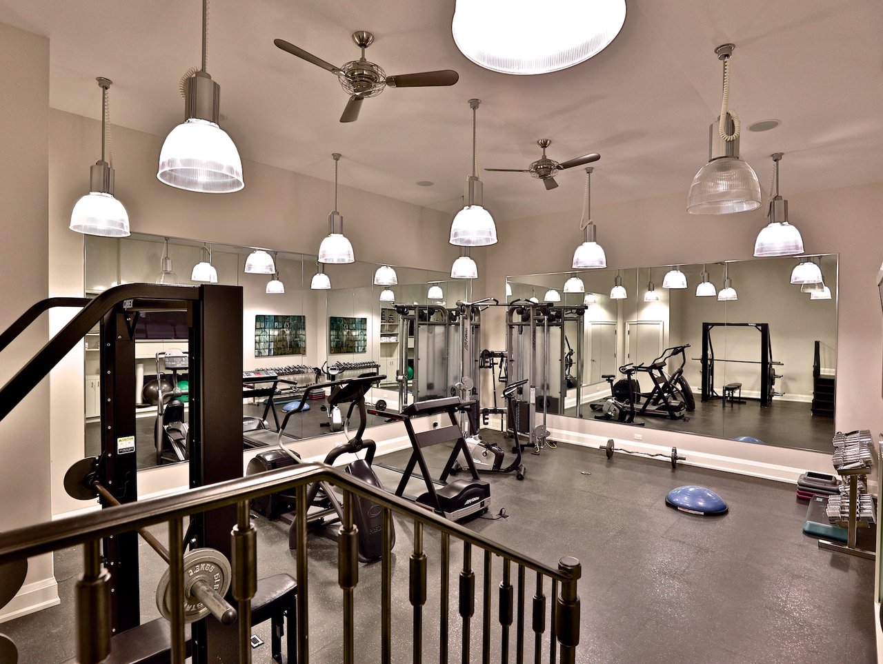 The Exercise Room, Sunken In Design And Entered Through A Pair Of Double Doors, Features Ceiling Fans, Specialty Gym Floor, Light Fixtures, Mirrored Walls, Built-In Speakers And Custom Built-In White Lacquer Cabinetry With Open Shelving, Built-In Television And Closed Cabinets.