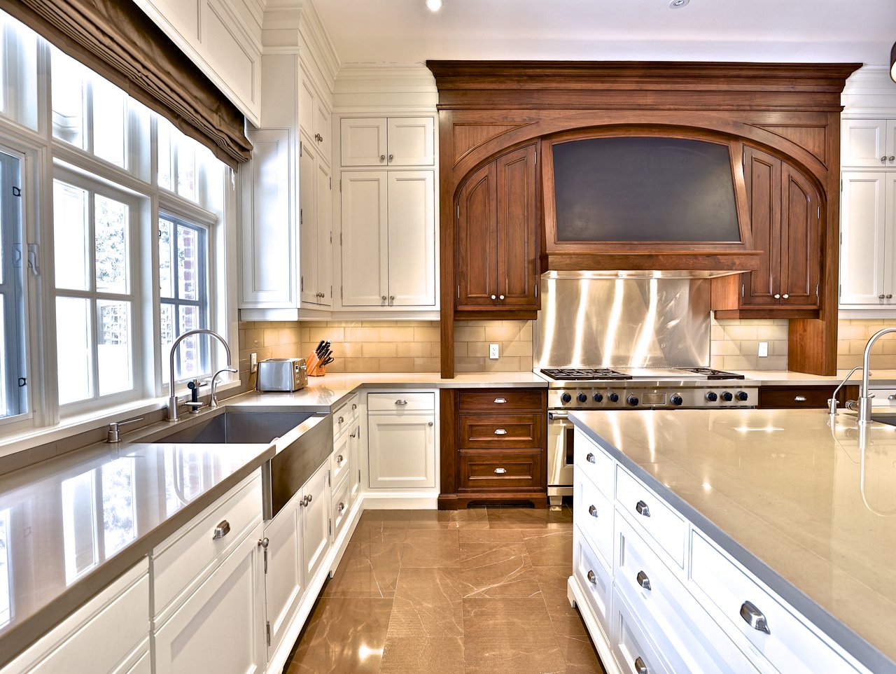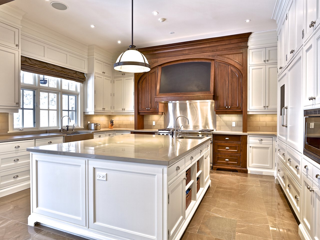 The Gourmet, Chef Inspired Kitchen, Open In Design To The Breakfast Area And Sitting Area, Features Heated Honed And Flamed Gris Pulpis Marble Floor, Crown Molding, Dark Wood Beamed Ceiling With Hand-Forged Iron Strapping, Custom Tongue And Groove Ceiling Design Over The Eating Island, Grigio Quartzite ¾ Slab Counters With Ogee Edge, Grigio Quartzite Backsplash, Custom Designed And Crafted Full Height Framed Cabinetry, An Expansive Movable Eating Island With Dark Counter, Open Shelving And Industrial Wheels, An Oversized Stainless Steel Farmhouse Sink With Groghe Faucet, Soap Dispenser, Insinkerator Garburators, Filtered Water Tap, Large Ribbed Glass And Bronze Pendant Lights Over Each Island, Recessed Lighting, Under Valence Lighting, A Window Outfitted With Custom Blinds Overlooking The Rear Gardens And Crown Molding. The Kitchen Also Features, Built-In Speakers, Several Glass Front Display Cabinets, Custom Wood Accents, An Expansive Cooking Island With An Additional Stainless Steel Under Mount Sink, Retractable Faucet, Insinkerator And An Instant Hot Water Tap.