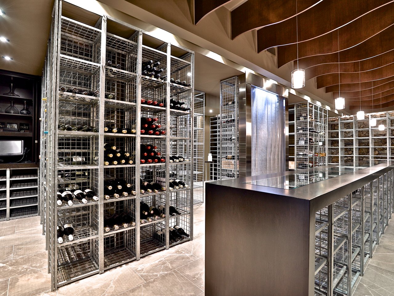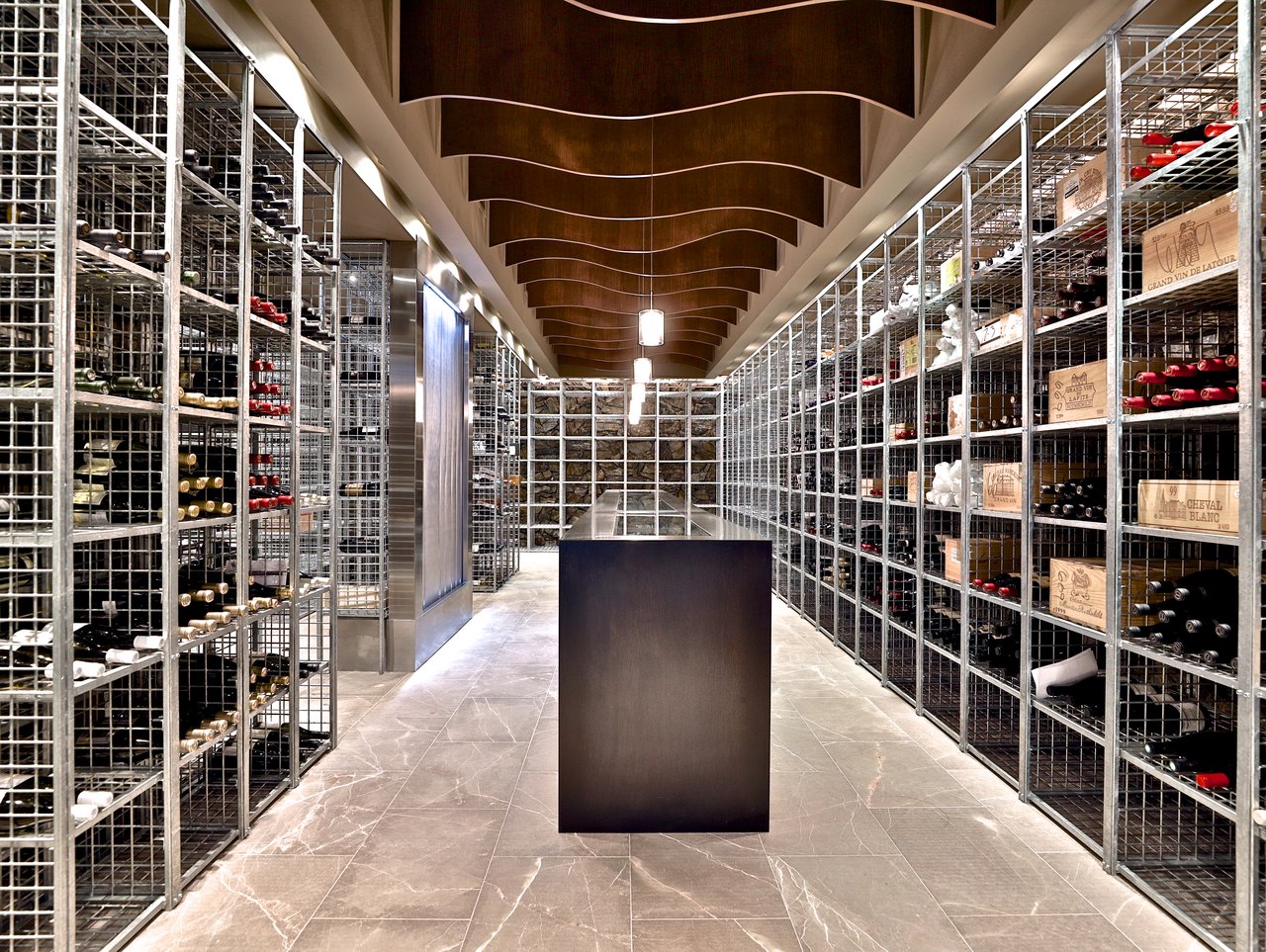 The Spectacular 15,000 Bottle Temperature And Humidity Controlled Wine Cellar, Entered Through Solid Wood Double Doors With Thermopane Glass And Lock, Features Security Sensors On Entry Doors, Modern Galvanized Custom Wine Shelving, A 21’ Long Tasting Island With A Glass Display Case, Exposed Rock Wall Feature, Wave-Effect Ceiling Design, Flamed Gris Pulpis Marble Floor, Pot Lights And A Stainless Steel Waterfall Feature Wall.