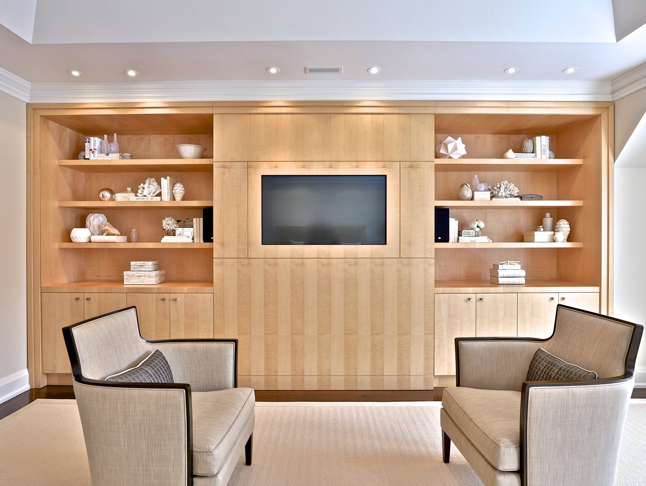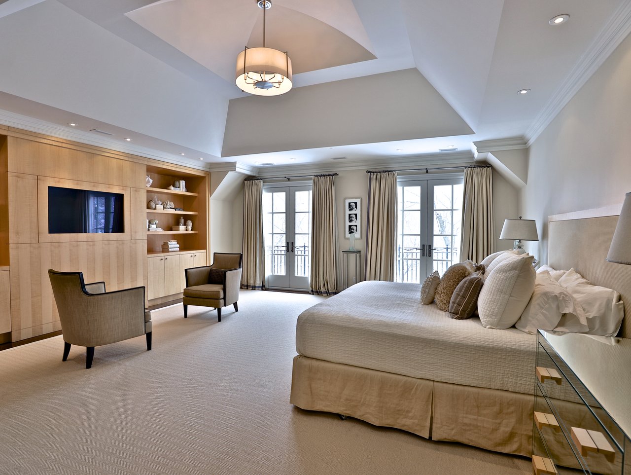 The Bedroom Area Features Walnut Hardwood Floor, Crown Molding, Double Vaulted Ceiling, Pot Lights, An Elegant Brushed Nickel Pendant With A Linen Shade, Custom Wall-To-Wall Light Birch Built-In Cabinets Comprised Of Open Display Shelving, Closed Cabinets And A Built-In TV, Two French Doors Outfitted With Custom Linen Drapery Overlooking The Rear Gardens And A Door Leading To The Laundry Room.