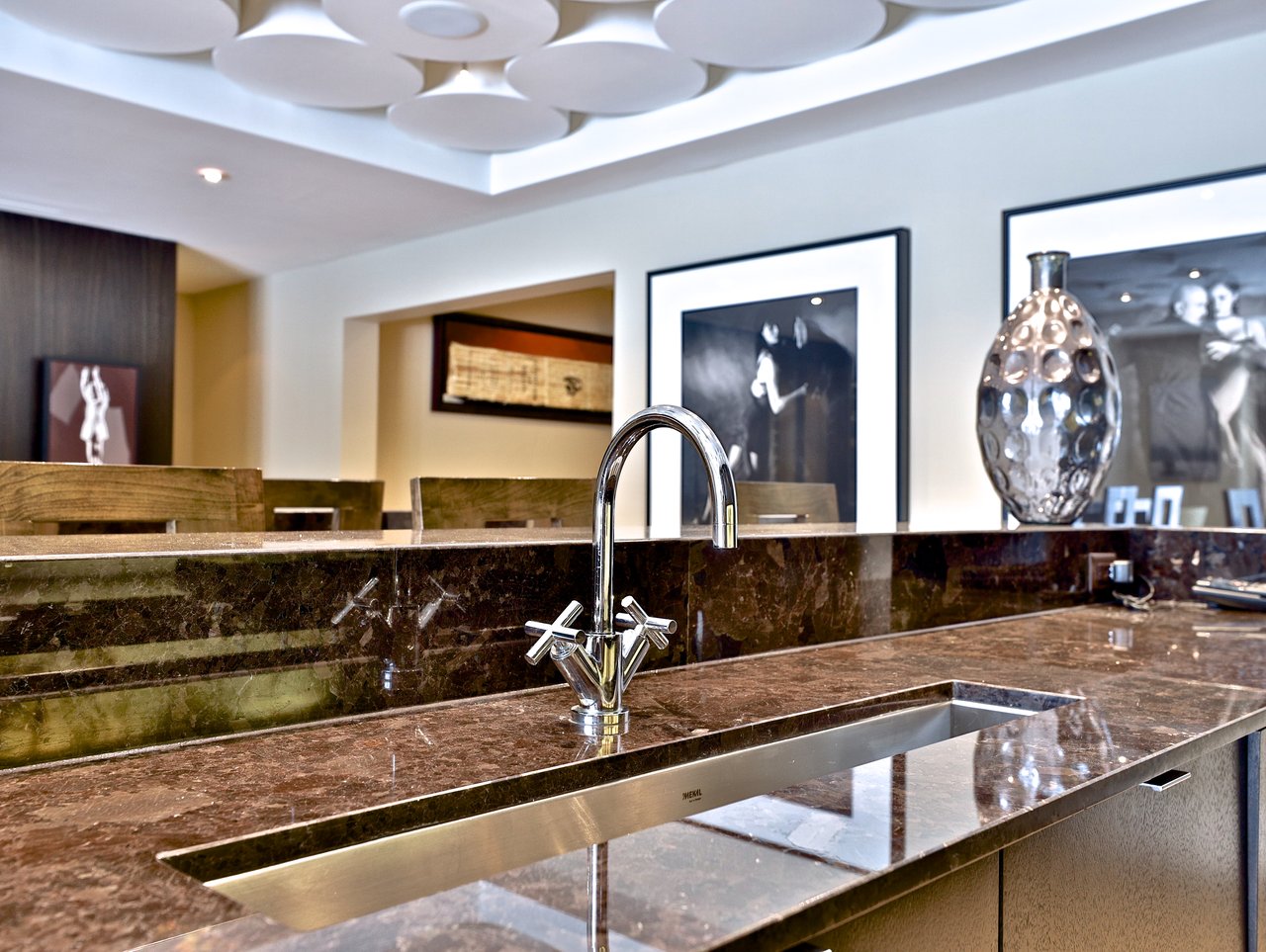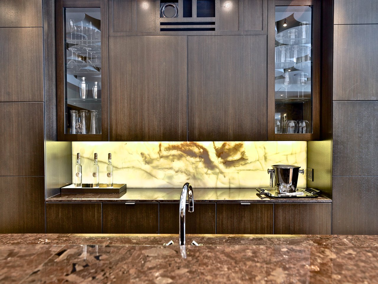 The Wet Bar, Open In Design To The Media Entertainment Room And Sitting Room, Features Gris Pulpis Marble Floor, Pendant Lightings, Built-In Speakers, Unique Custom Circular Ceiling Design, A Waterfall Marble Bar, Custom Designed And Crafted Dark Stained Rift Cut Oak Cabinets, A Stainless Steel Under Mount Sink, Ample Storage And Pull Out Drawers, A Backlit Onyx Back Splash And Several Glass Front Cabinets.