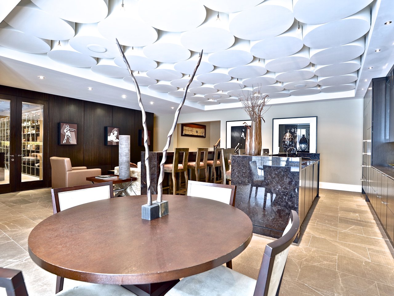 The Media Entertainment Room, Open In Design To The Wet Bar And Sitting Room, Features Flamed Gris Pulpis Marble Floor, Unique Custom Circular Ceiling Design, A Custom Waterfall Marble Eating Bar, Projector And Screen, Built-In Speakers, Wall Speakers And Subwoofer Disguised As Art, Pot Lights And A Pair Of Doors Opening Onto The Wine Cellar.