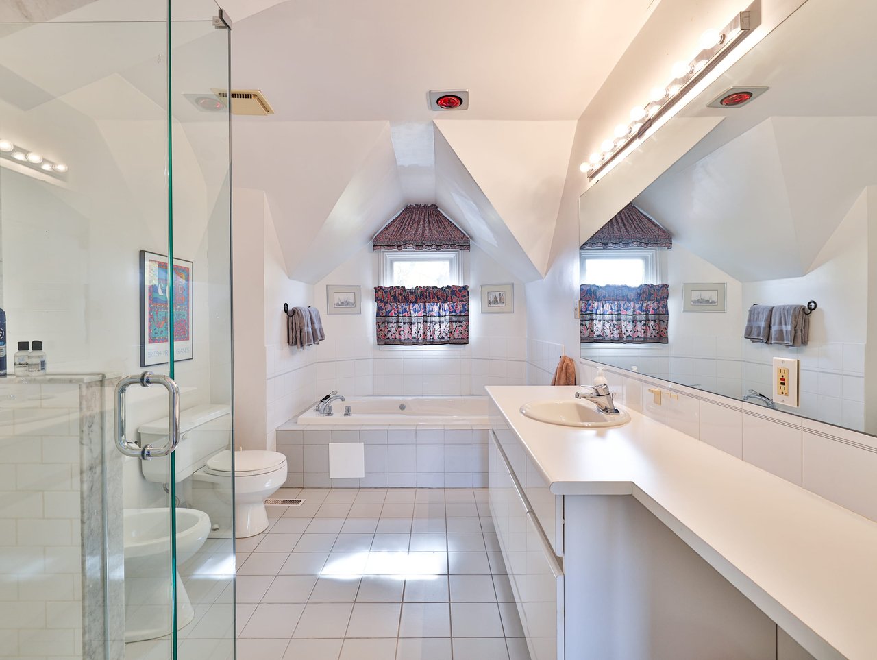 The 6-piece ensuite features tile floor, vaulted ceiling, a vanity, mirror, dressing room light, a window overlooking the front gardens, a jet tub with a tile surround and a seamless glass shower with a handheld faucet and marble frame.