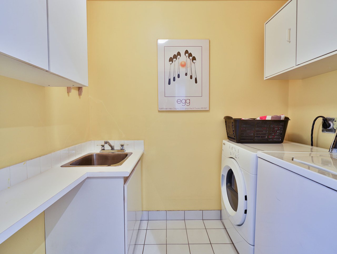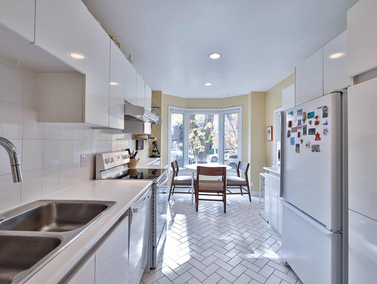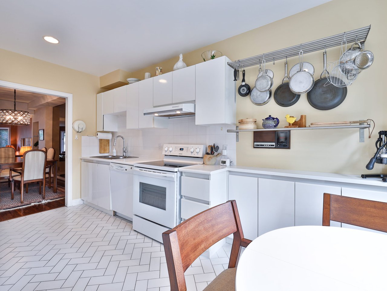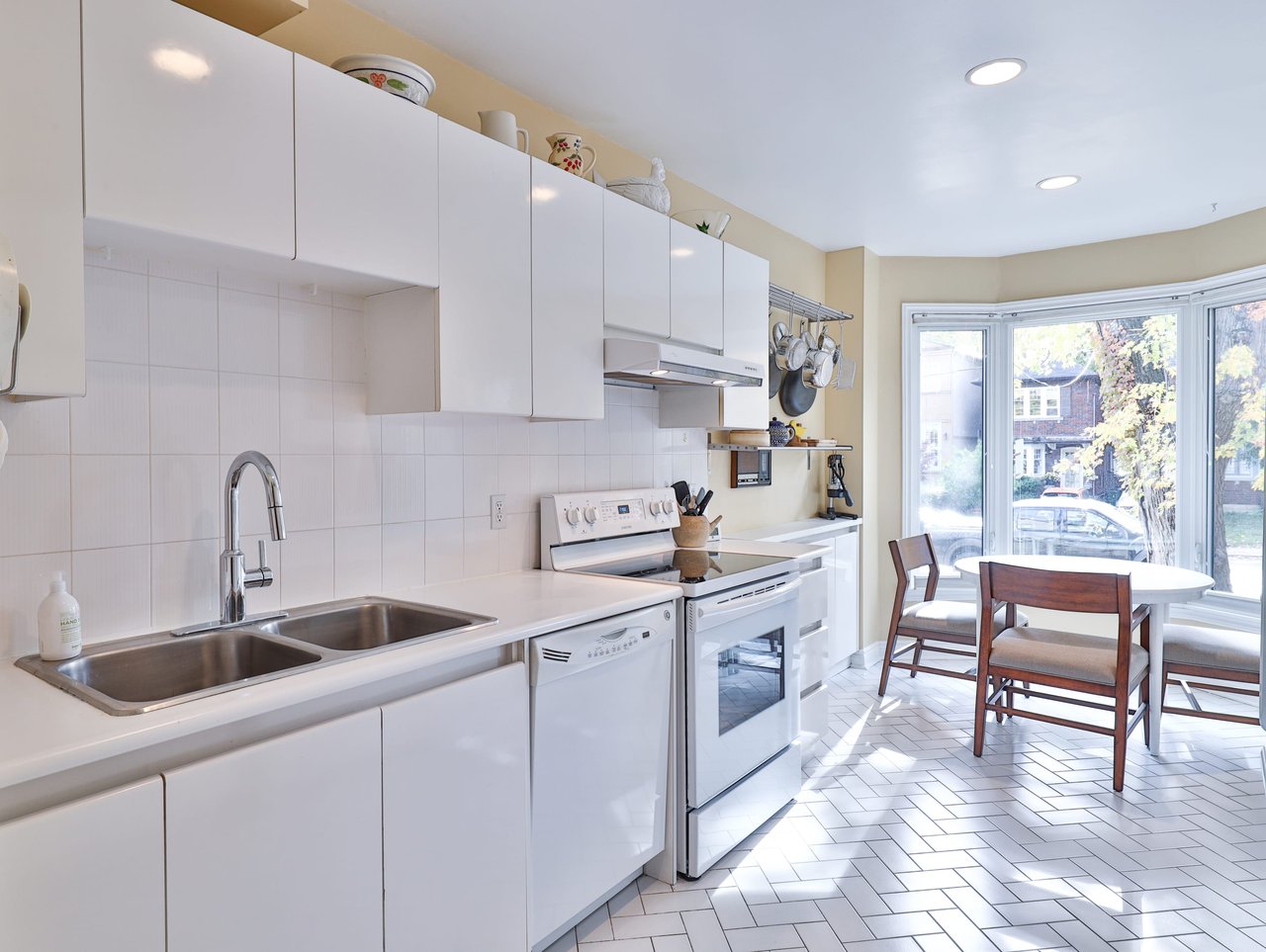 The eat-in Kitchen, entered through a pair of pocket doors, features tile floor, pot lights, tile backsplash, custom cabinetry and a dual bowl stainless steel sink complete with a retractable faucet.