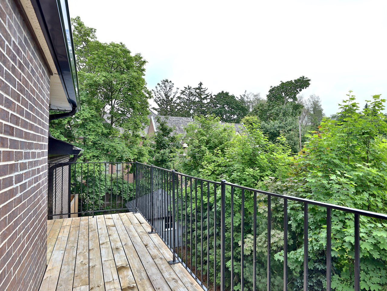 The Master Suite features an 8-piece ensuite, an expansive walk-in closet, crown molding, a light fixture, access to the private staircase from the side of the home, hardwood floor and two sliding glass door walk outs to the balcony overlooking the rear gardens.