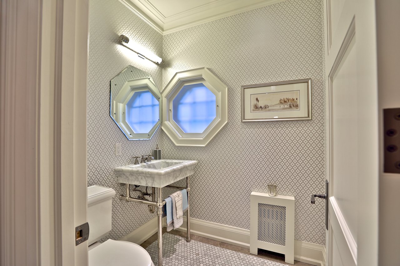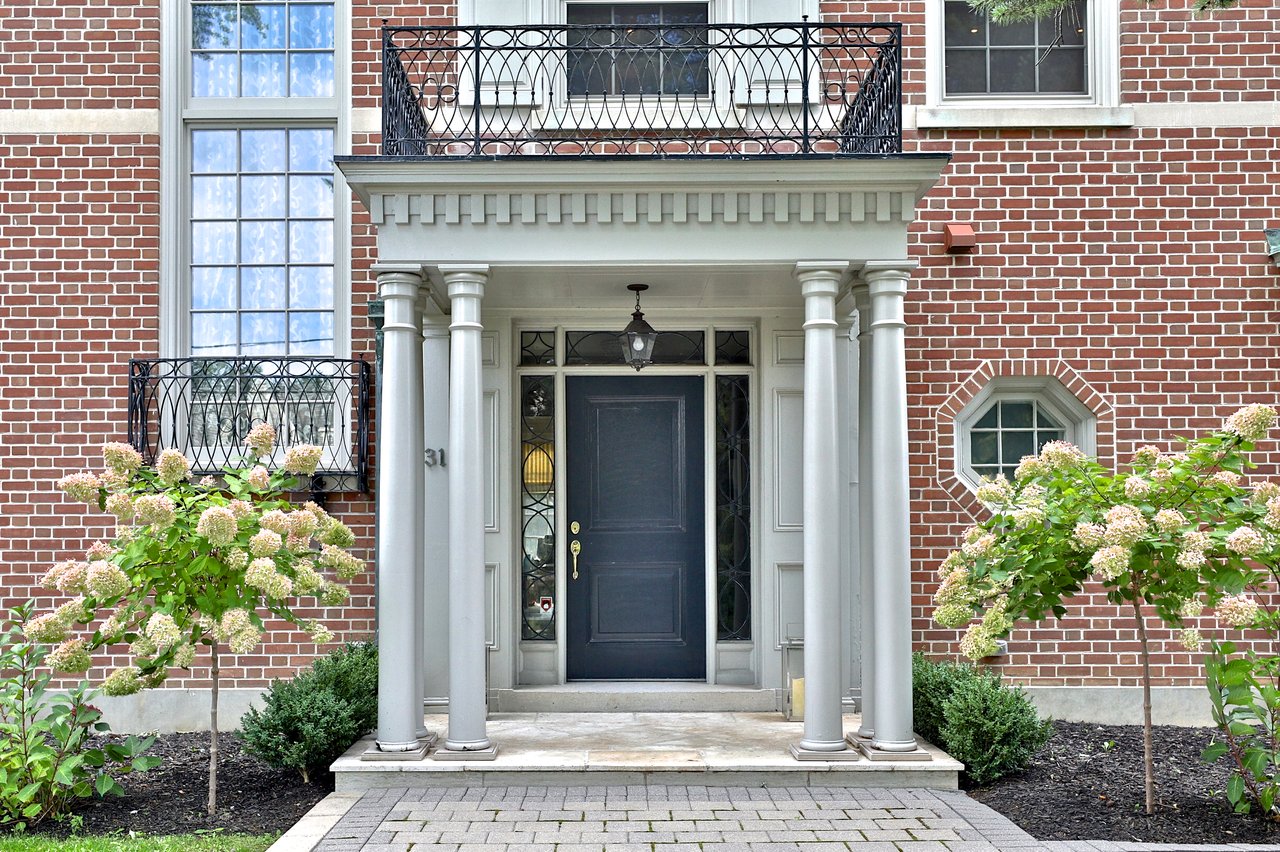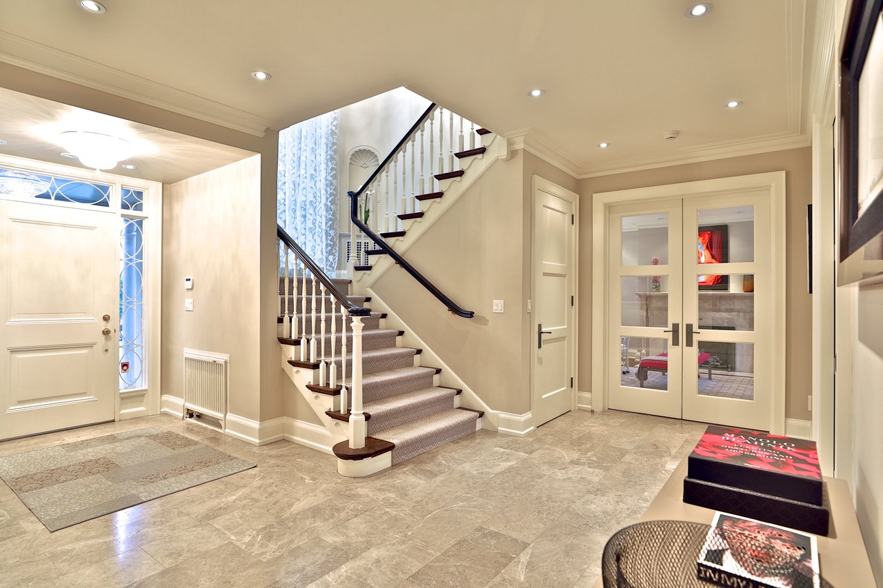 The Foyer features a solid wood entry door with side transoms, heated gray emperador honed marble floor, double cloak closet complete with auto lighting and custom built-ins, a chandelier, pot lights, alarm pad, crown moulding, entries to principal rooms, art niches, a floor to ceiling window outfitted with custom drapery overlooking the front gardens and an imposing off side oak staircase with a broadloom runner, wood handrail and white pickets.