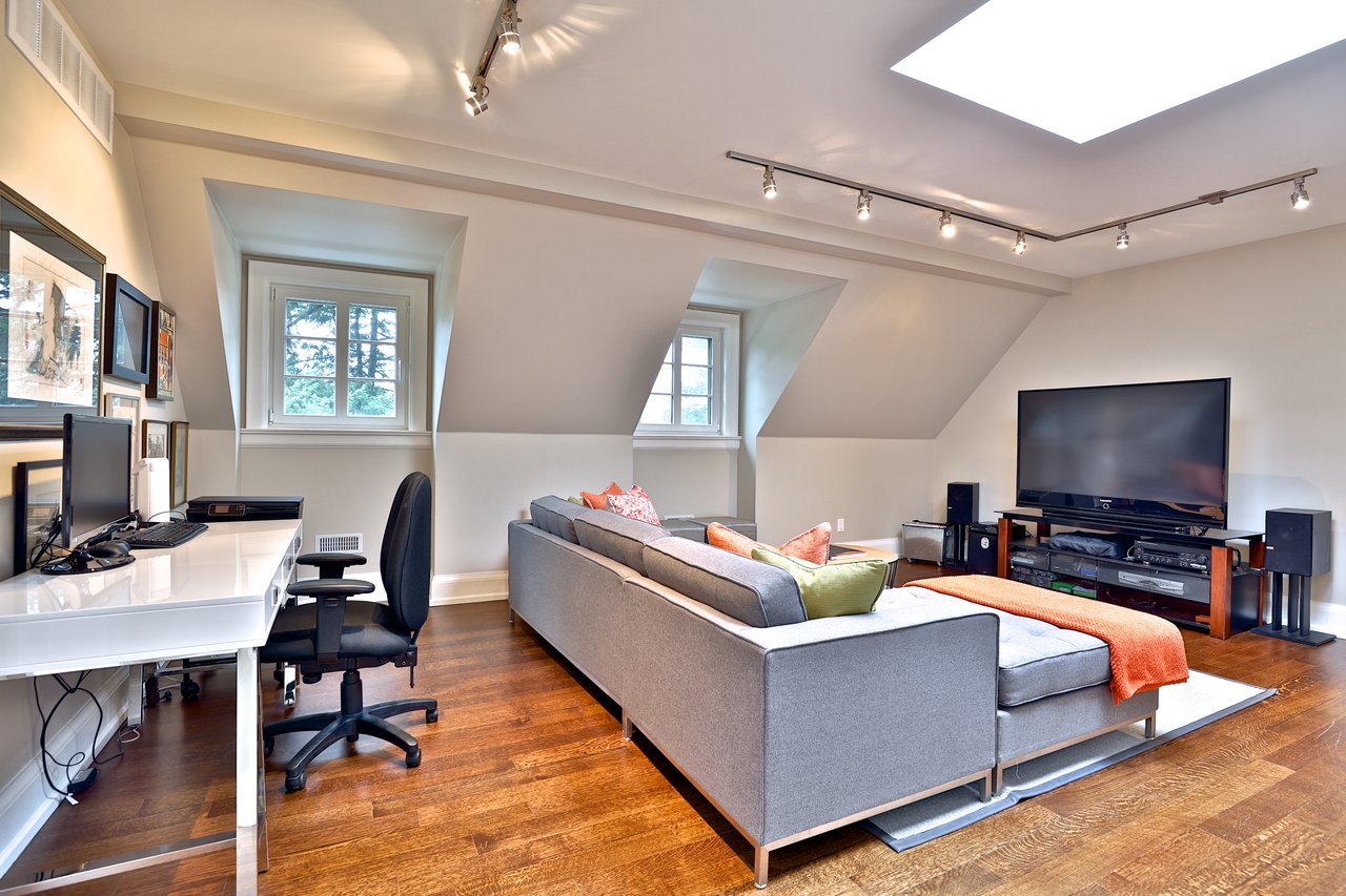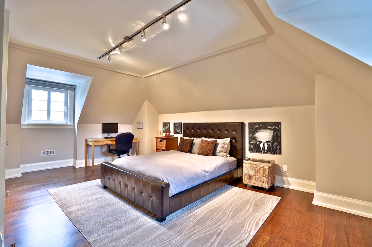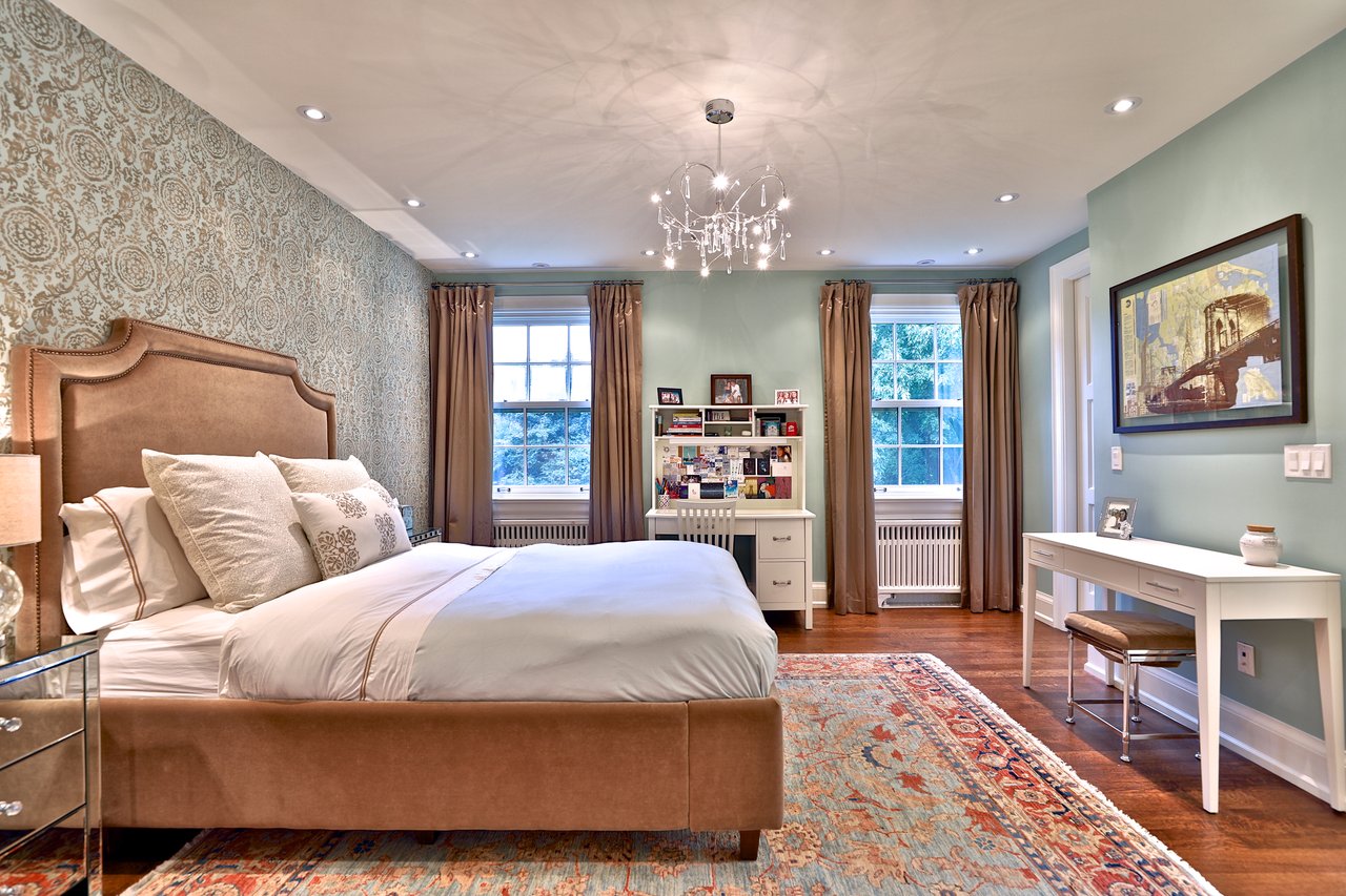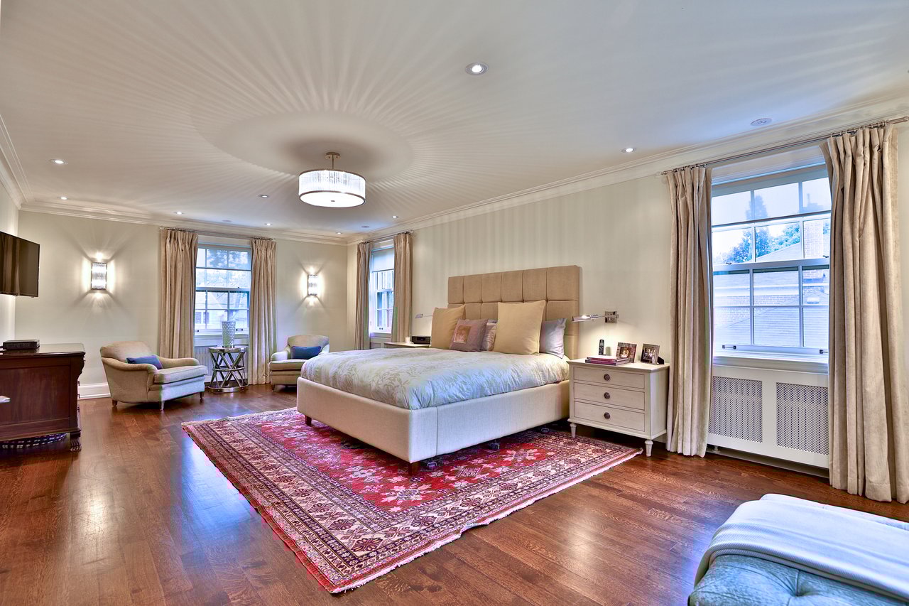 The private Master Bedroom features a dressing room, a 7-piece ensuite, windows outfitted with custom drapery and Hunter Douglas blinds overlooking the side, front and rear gardens, crown molding, a glass chandelier with matching wall sconces, pot lights and quarter sawn white oak hardwood floor.