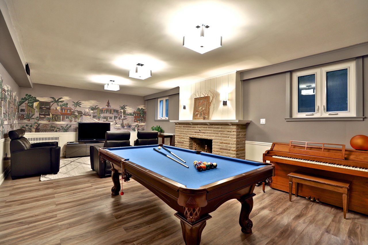 The Recreation Room, features a wood burning fireplace with a wood mantle, bead board accent, wall sconces, hand painted Italian fresco scene, light fixtures, a walk-in closet, windows and luxury vinyl plank flooring.
